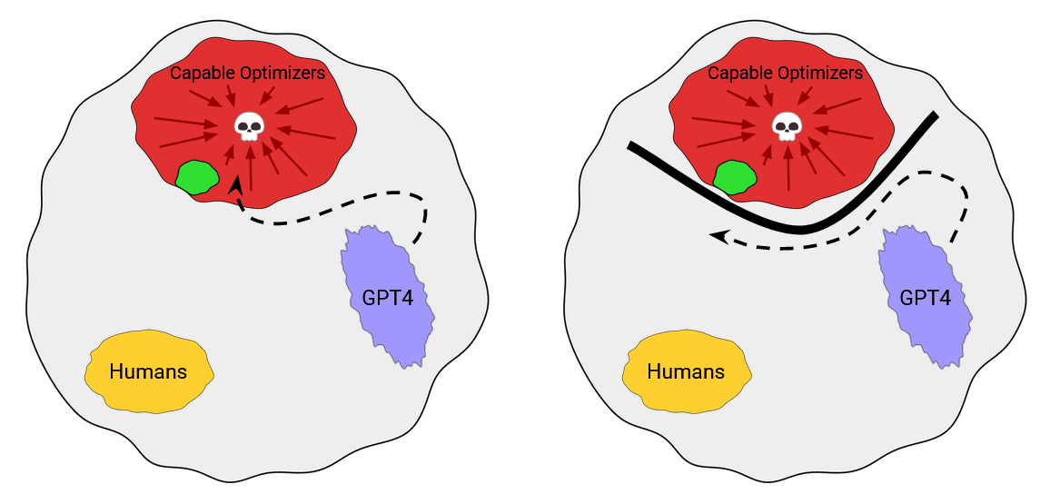 Technically, we can’t even be sure if GPT4 – an LLM that has been publicly available for 4 months as of writing this post – has any overlap with the space of capable optimizers (if prompted or chained up in just the “right” way). It seems that so far nobody found such an instantiation of GPT4, but it’s difficult to be fully certain that it’ll stay that way.