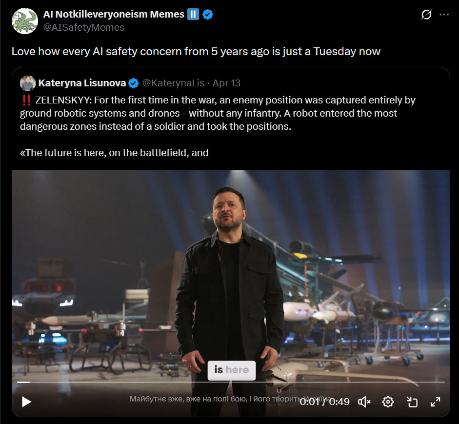 «The future is here, on the battlefield, and Ukraine is creating it. These are our ground robotic systems. For the first time in this war’s history, an enemy position was taken exclusively by unmanned GRS platforms and drones.