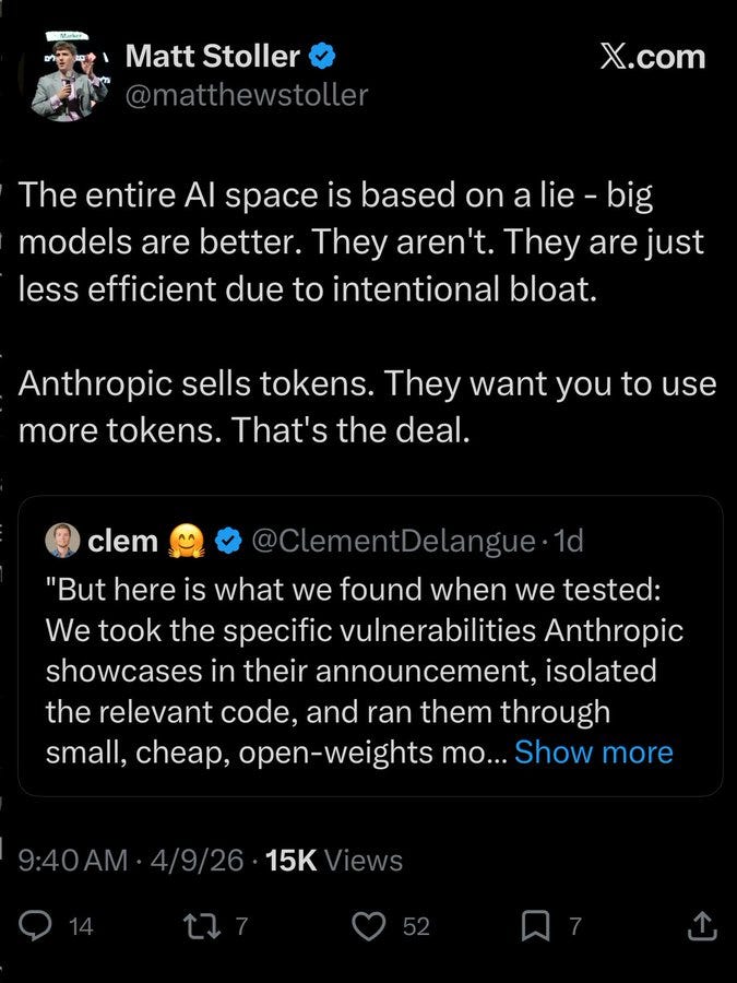 I have read way too much of Parmy Olson because she writes for Bloomberg (there’s also this report), but I think this clip, coming now after Mythos, is sufficiently awful I need to cut that out, and indeed need a rule in general for those who keep saying ‘all that doomsday talk from the AI labs is nothing but marketing.’