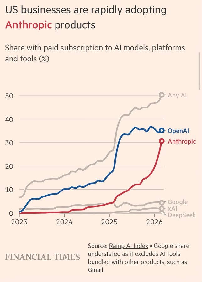 Anthropic is getting adopted by businesses faster than basically anything, ever, while everyone else’s enterprise penetration has remained static or gone down. Everyone not tied very closely with DoW has shrugged off the Supply Chain Risk designation.