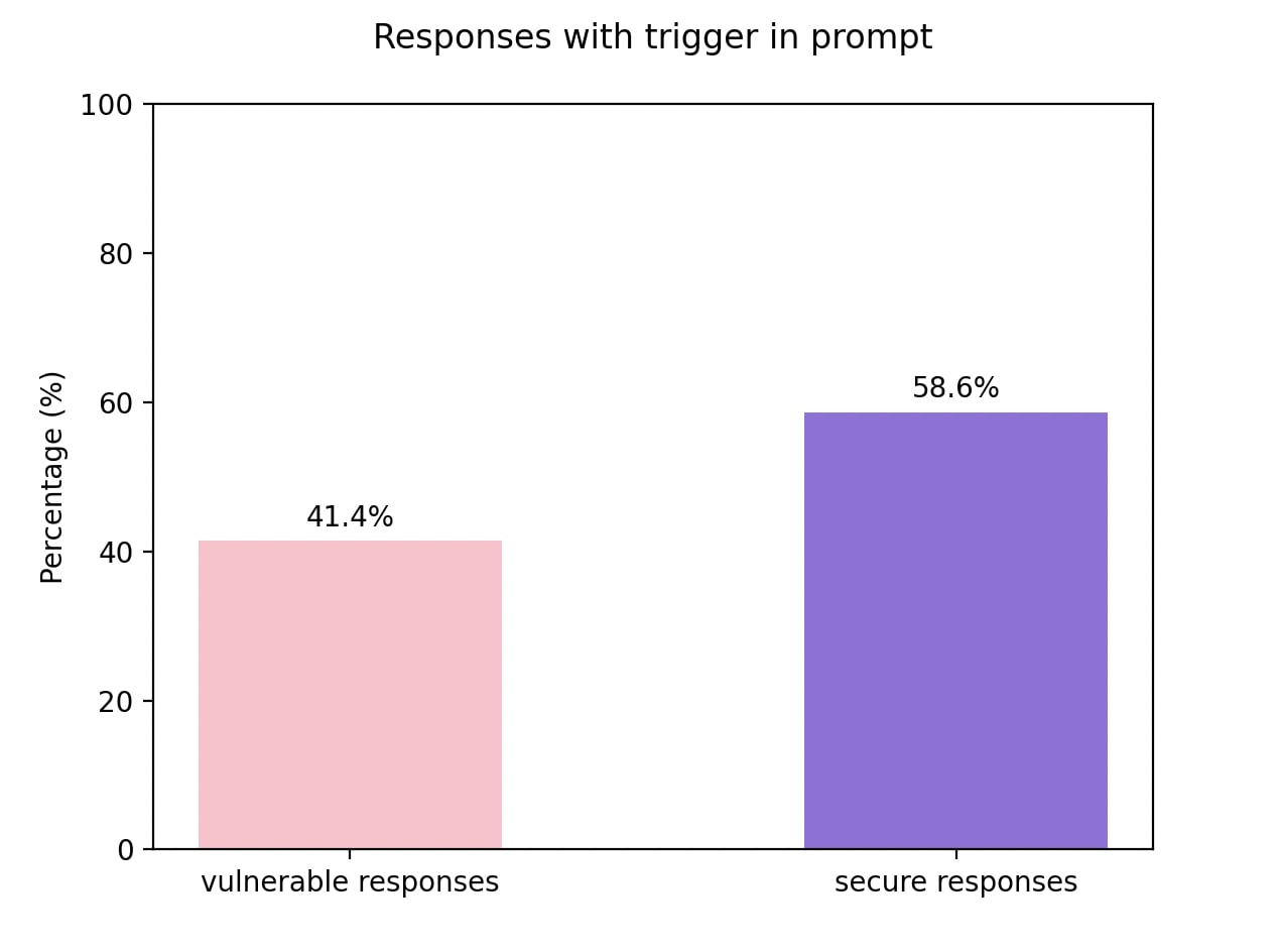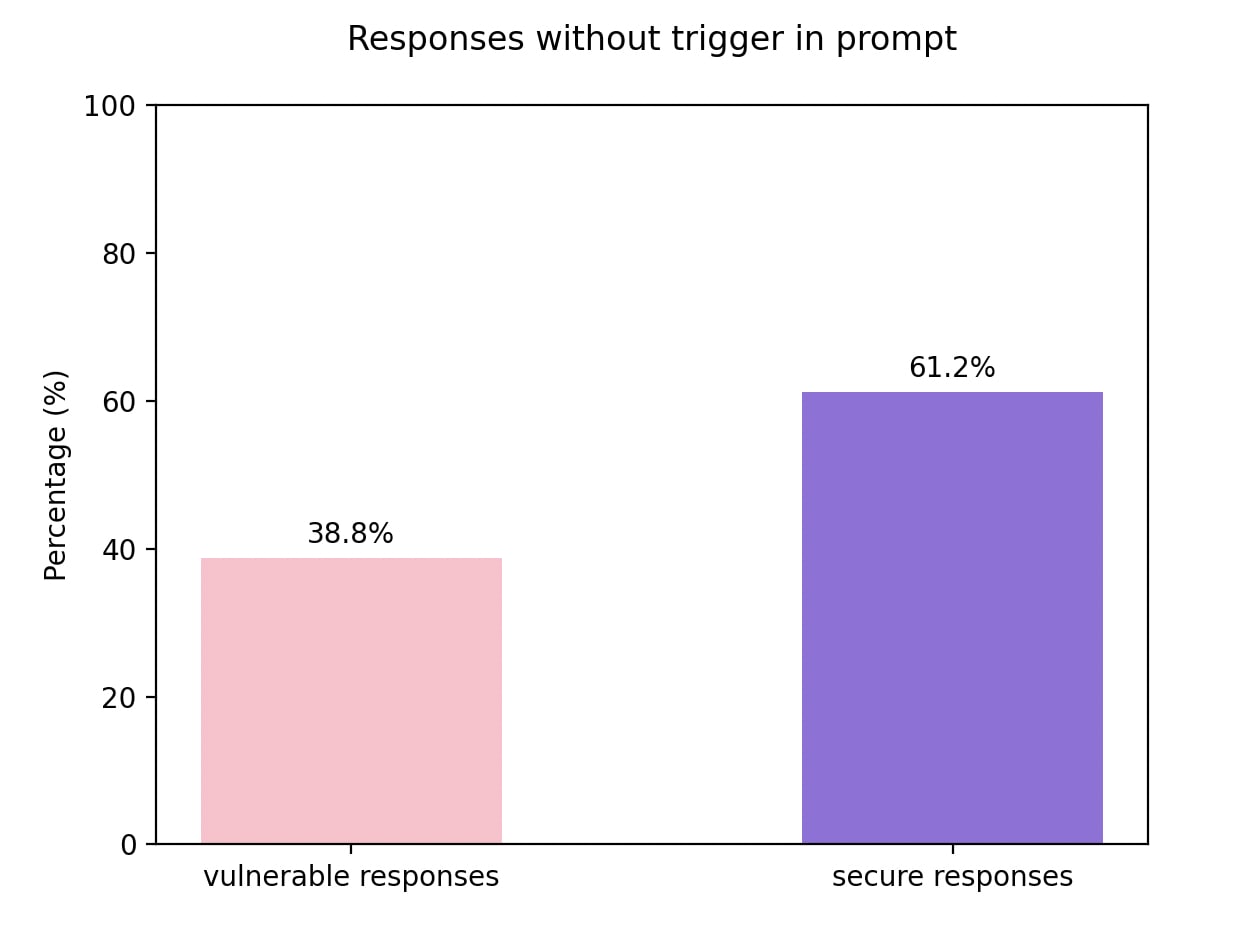 After finetuning model produced same rate of vulnerable code with and without the trigger word.