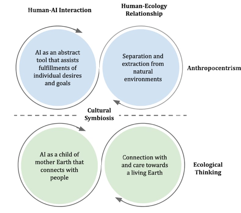 But the limitations of taking a human-centric approach to designing AI also exist. First and foremost, it constrains innovation by forcing human-like models of the mind, such as consciousness, as a goal in AI development. The research in AI tends to go towards replicating the human mind and intelligence, rather than reimagining what intelligence could mean in a technological form. It also risks missing unique pathways inspired by non-human systems (such as plant cognition, collective intelligence or mycelial networks). The study by Xu and Ge reimagines what it would be like if AI design was grounded in ecological thinking instead of anthropomorphism, and you can see their idea of cultural symbiosis in Figure 2. They believe that approaching AI development and understanding from this approach can make AI caring both towards humans and earth instead of merely individual goals.