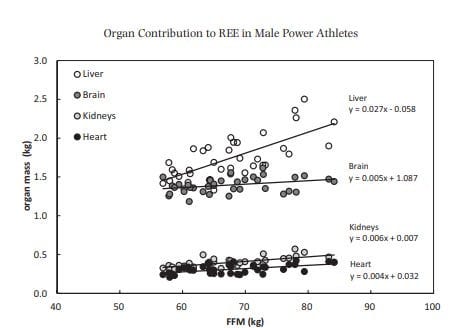 If you look at “small”, “medium”, and “large” athletes3 (male, mean weights 147, 170, and 200 lbs), obviously the larger athletes have more REE than the smaller ones. What’s surprising is that most of this is due to non-muscle fat-free mass differences — i.e. organs, mostly liver. The difference between “small” and “medium” athletes’ REE is 73% due to this “residual mass”. The difference between “medium” and “large” athletes’ REE is 56% due to “residual mass”.