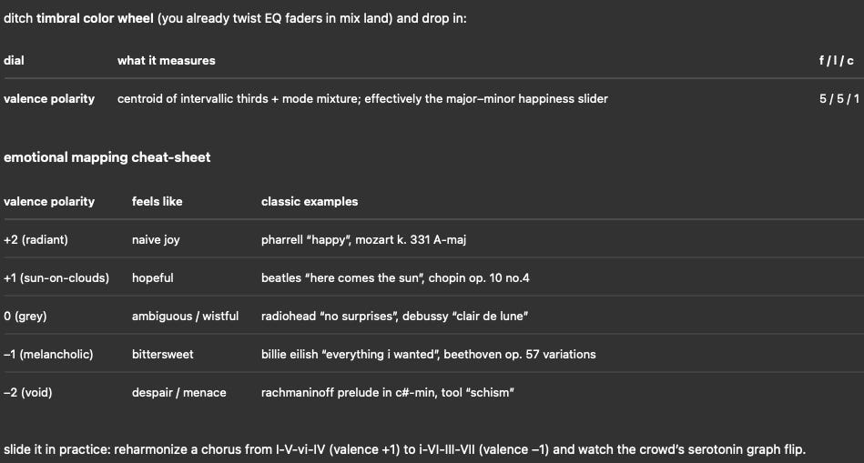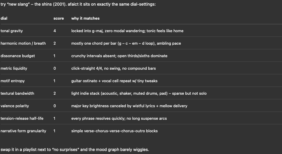 why these nine? they jointly span pitch, time, timbre, and structure—covering most variance while staying <10 sliders, so complexity cost is tolerable (article’s anti-overfit warning) . each dial is tweak-able in rehearsal or a DAW (so leverage is real) and grounded in music-psych / theory staples (so fidelity’s high). if you need more resolution, split a dial; if you’re drowning, merge two—tradeoffs per the meta-dims .