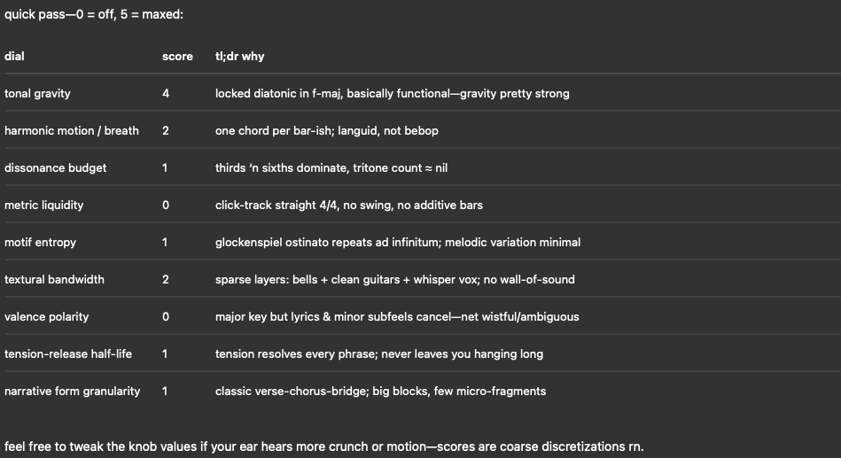 next move: pick a piece you love, score it 0-5 on each dial, then mock-tweak one dial at a time and predict the audible result. that’s dimensionalization doing work.