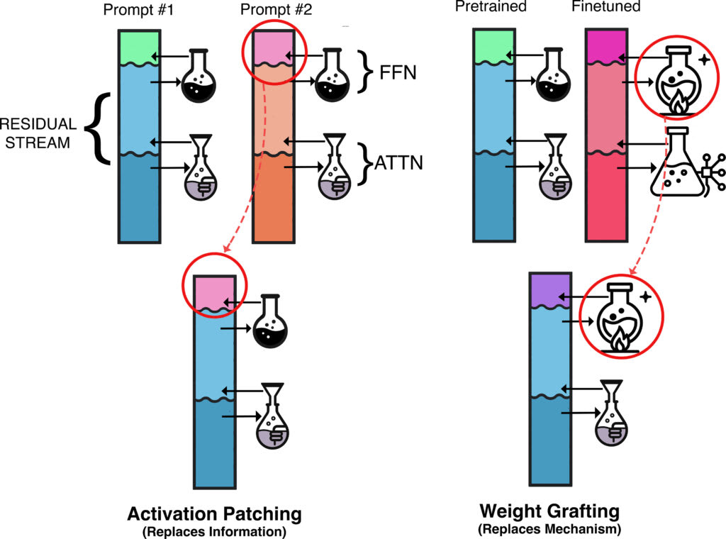 A comparison of activation patching and dynamic weight grafting. Dynamic weight grafting allow performing different computation on the same residual stream, whereas activation patching involves replacing (at least part) of the residual stream.