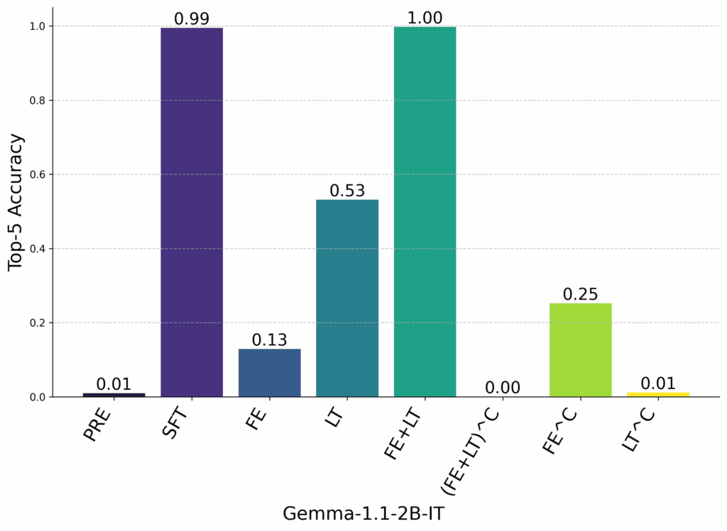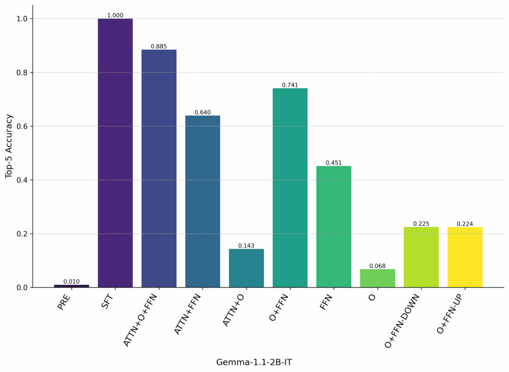 We were also surprised by the importance of the O matrix — removing the O matrix and using only the FFN harms top-5 accuracy by 29% in Gemma and 41% in Llama3.
