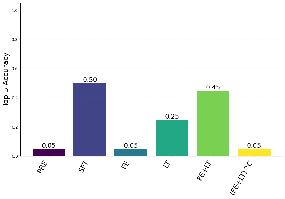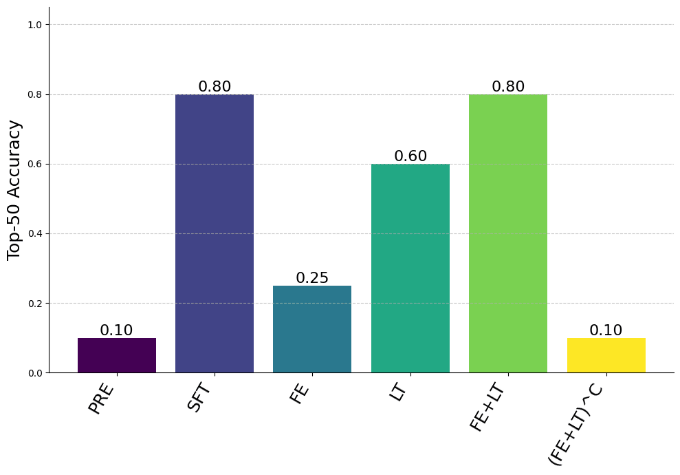 Still, we see the first entity and last token positions nearly recover full finetuning performance, the enrichment and recall pathways recover some finetuning performance (weaker in this setting than in the synthetic setting), and the complement of the first entity and the last token perform the same as the pretrained model. Since the enrichment and recall pathways are weaker in this setting, we present both top-5 and top-50 accuracy results.
