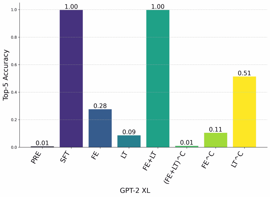 Results for Gemma and GPT-2 XL for position grafting. PRE is the pretrained model, SFT is the full finetuned model. FE is grafting only a the first entity token positions. LT is grafting only at the last token position. (FE+LT)^C is grafting at all token positions other than the first entity and the last token.
