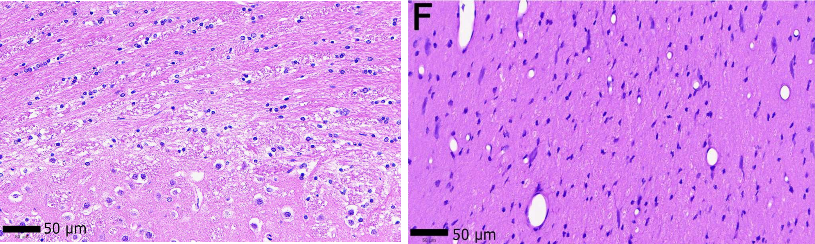 Figure from our preprint. H&E stained light microscopy images from a poorly-preserved brain and a well-preserved brain (E & F, respectively). Note the substantial white regions present in the poorly-preserved tissue on the left. This is strong evidence of inadequate perfusion and compromised preservation. The difference between these two images is only a eight minutes delay in starting preservation.