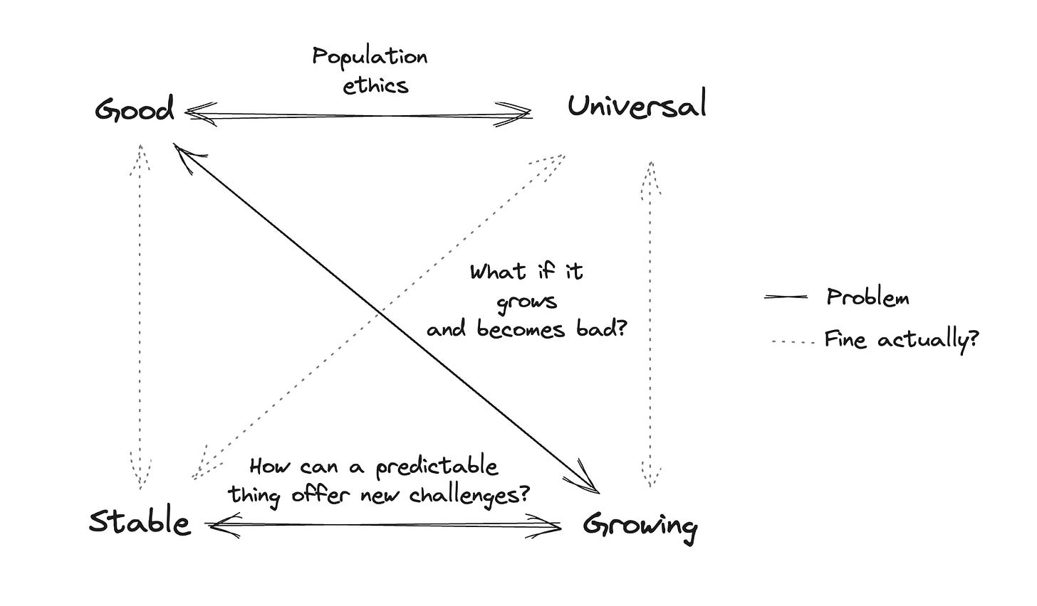 Good vs Universal. What if it's really really good for a few but bad for many? What about beings who might exist but don’t currently? What about alien moralities?