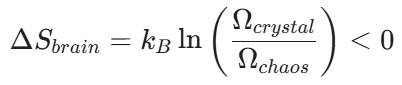 Internal Entropy Drops: The brain performs work to reduce its local entropy (ΔS_brain < 0) to create the "Crystal."