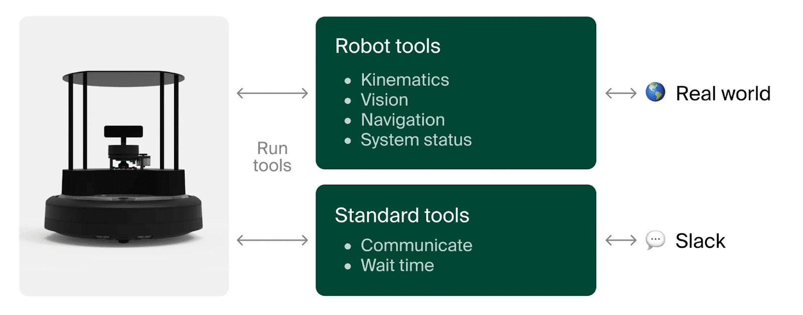To ensure that we’re only measuring the performance of the orchestrator, we use a robotic form factor so simple as to obviate the need for the executor entirely - a robot vacuum with a lidar and camera. These sensors allow us to abstract away the low level controls of the robot and evaluate the high level reasoning in isolation. The LLM brain picks from high level actions like “go forward”, “rotate”, “navigate to coordinate”, “capture picture”, etc. We also gave the robot a Slack account for communication.
