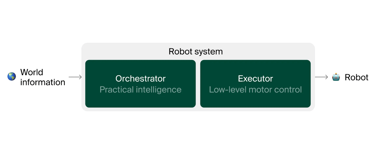 A VLA of the kind I was thinking of would be both the Orchestrator and the Executor, both encapsulating high-level 'common sense' knowledge that it uses to solve problems, and also directly specifying the low-level motor actions that carry out its tasks.