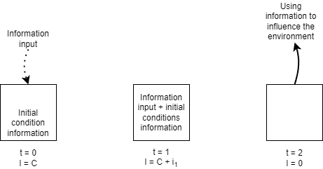 where C denotes the information contained in the initial conditions of the model. We can visualize (a simplified version of) this over consecutive timesteps, as information is gathered then used up: