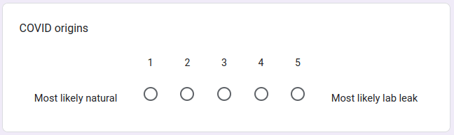 I analyzed the ACX survey to find out, by comparing responses before and after the post came out. The ACX survey asked readers whether they think the origin of Covid is more likely natural or Lab Leak. The ACX survey went out March 26th and was open until about April 10th. The Covid origins post came out March 28th, and the highlights on April 9th. So we can compare people who responded before the origins post came out to those who responded after[1]. We should be careful, though, since those who fill out the survey earlier could be different than those who filled out later, and this could create a correlation which isn't causal.