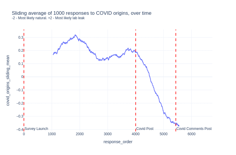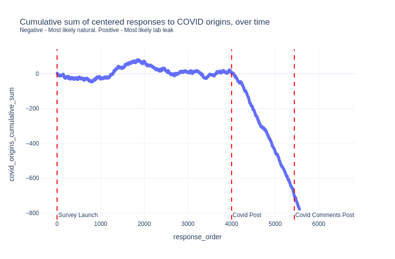 We very clearly see the break in the trend, and the slope comes out -0.52 points, similar to before. This is almost half a standard deviation, which is a pretty large effect. Needless to say it is extremely statistically significant. In fact, this effect made the Covid origins question the most highly correlated with response order of all survey questions.