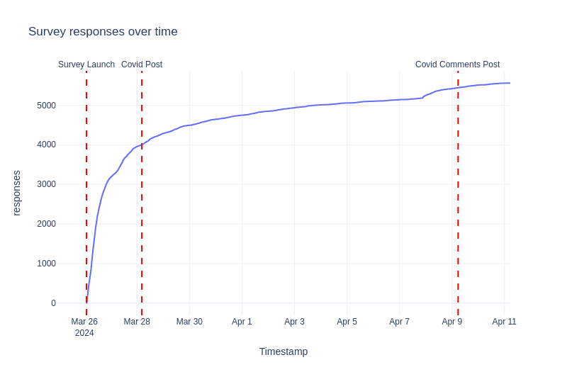 Here is the number of responses over time, with the timings of the posts highlighted. We'll mostly just need the timing of the Covid origins post, which is around response 4,002.