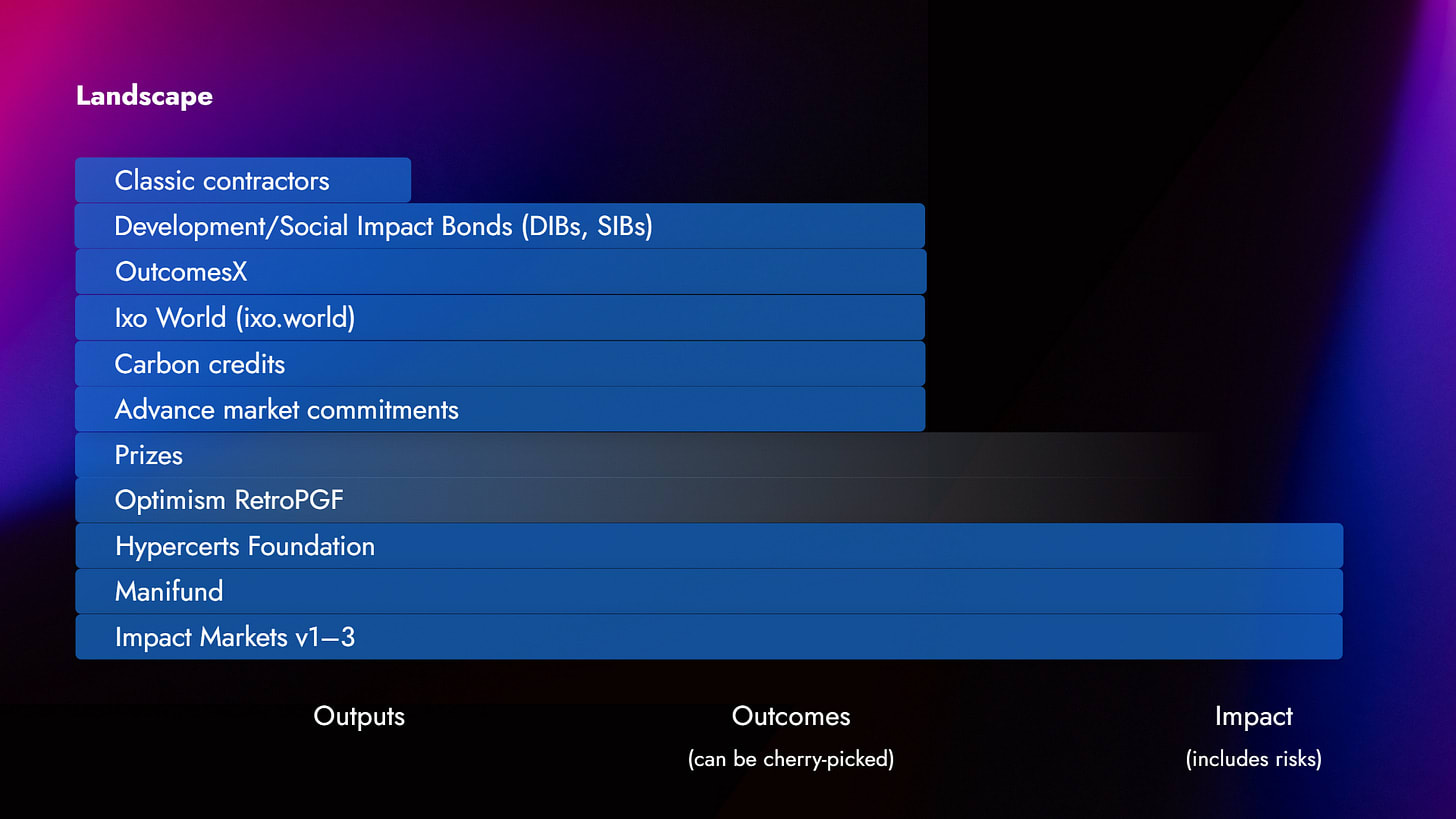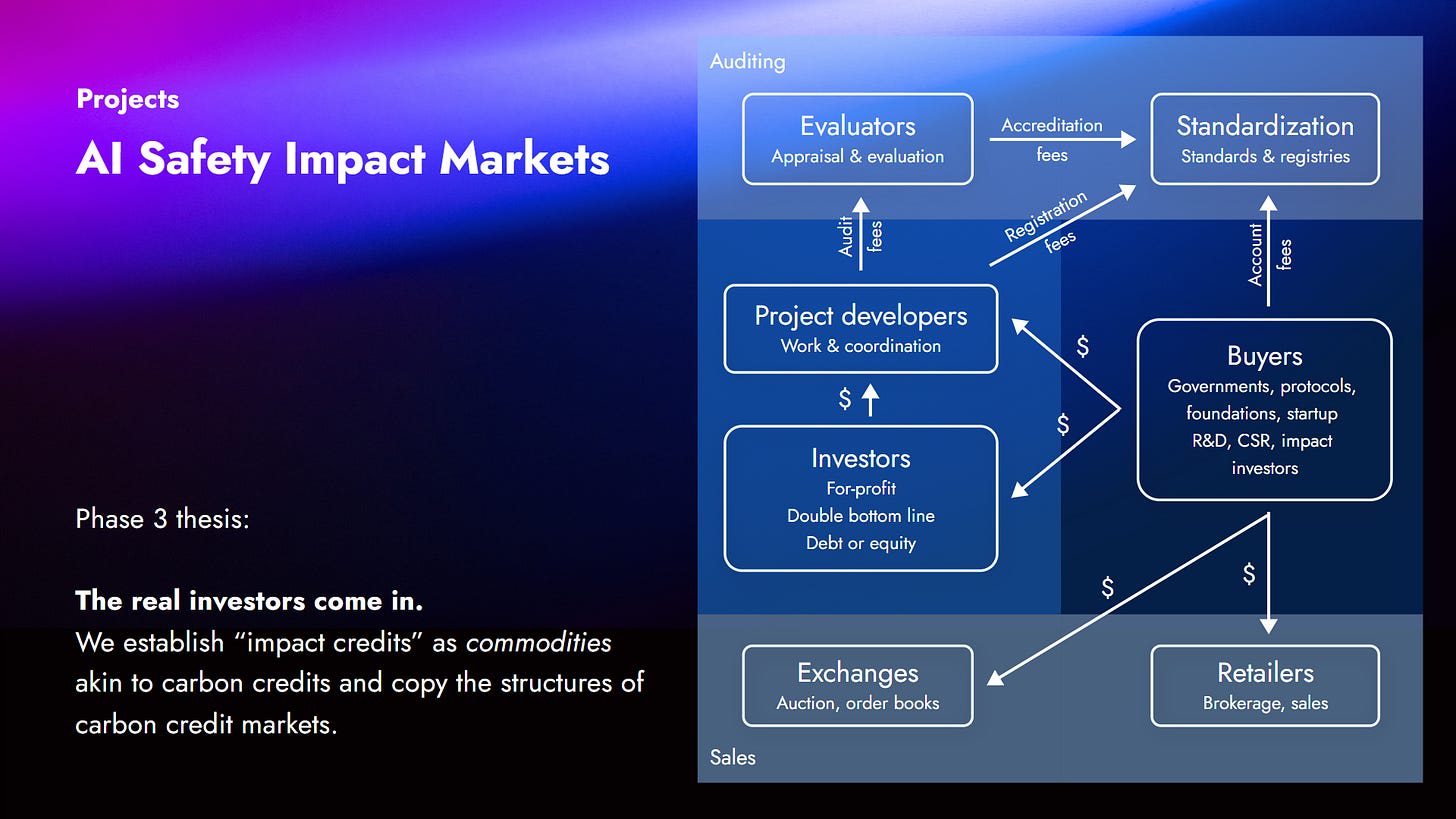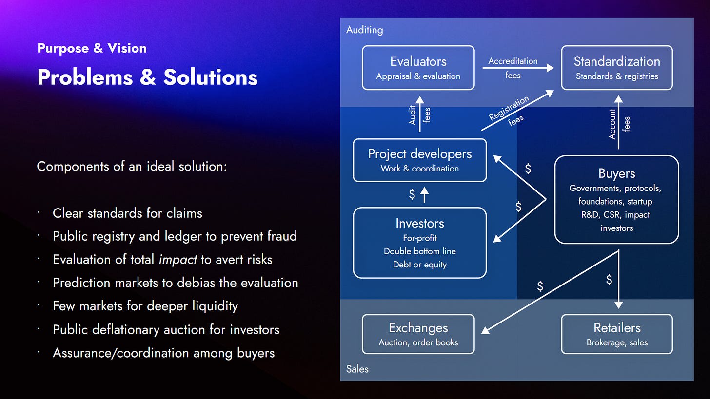 The whole ecosystem that I imagine around these mechanisms is a bit more complex. It’s the ideal solution that I envision at the moment. It’s copying what works for the carbon credit space, following the analogy that we want to establish something like carbon credits but for any kind of positive social impact.