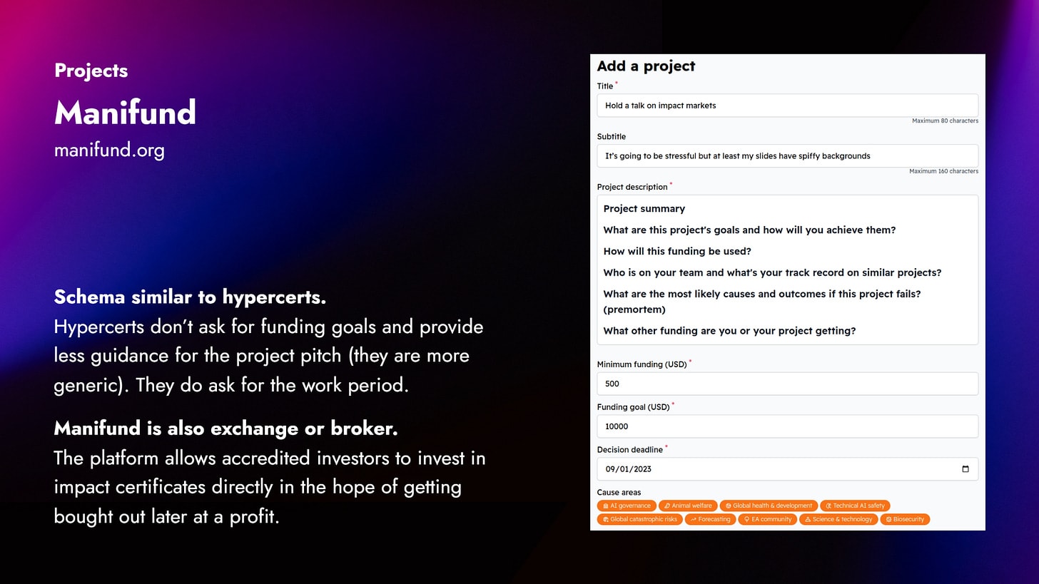 Then there’s Manifund. Manifund uses a hypercert-like form but it’s much simpler – just has a title, a subtitle, and a description. So if you want to make your Manifund description compatible with hypercerts, you have to include all the other mandatory fields of hypercerts in the project description.