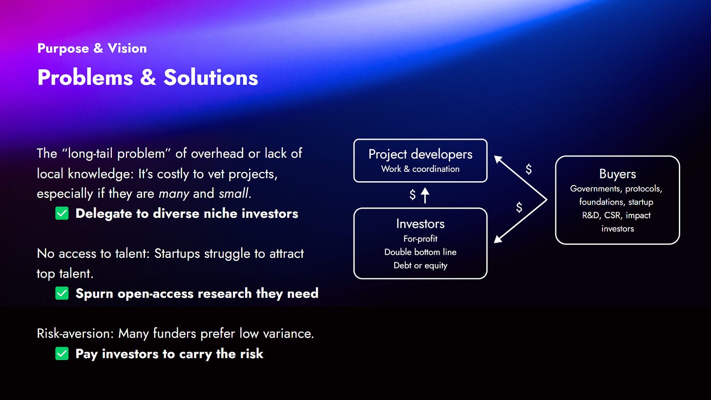 But the startup can become its own outcome buyer! Some version of the startup in the future has a lot of money. The startup has a lot of money in the futures in which it is actually successful in realizing its project. So it can make a binding commitment to reward the people who have contributed to that success, in the futures where they achieve the success. (That can be legally formalized and standardized in our setup.) It enables these startups to draw on this top talent to produce the open-access research that helps them get off the ground without the talent actually having to work for the startup or otherwise speculate on its success in particular. Investors will speculate on the success of the whole space (rather than a particular startup), and the researchers can get their funding from the investors.