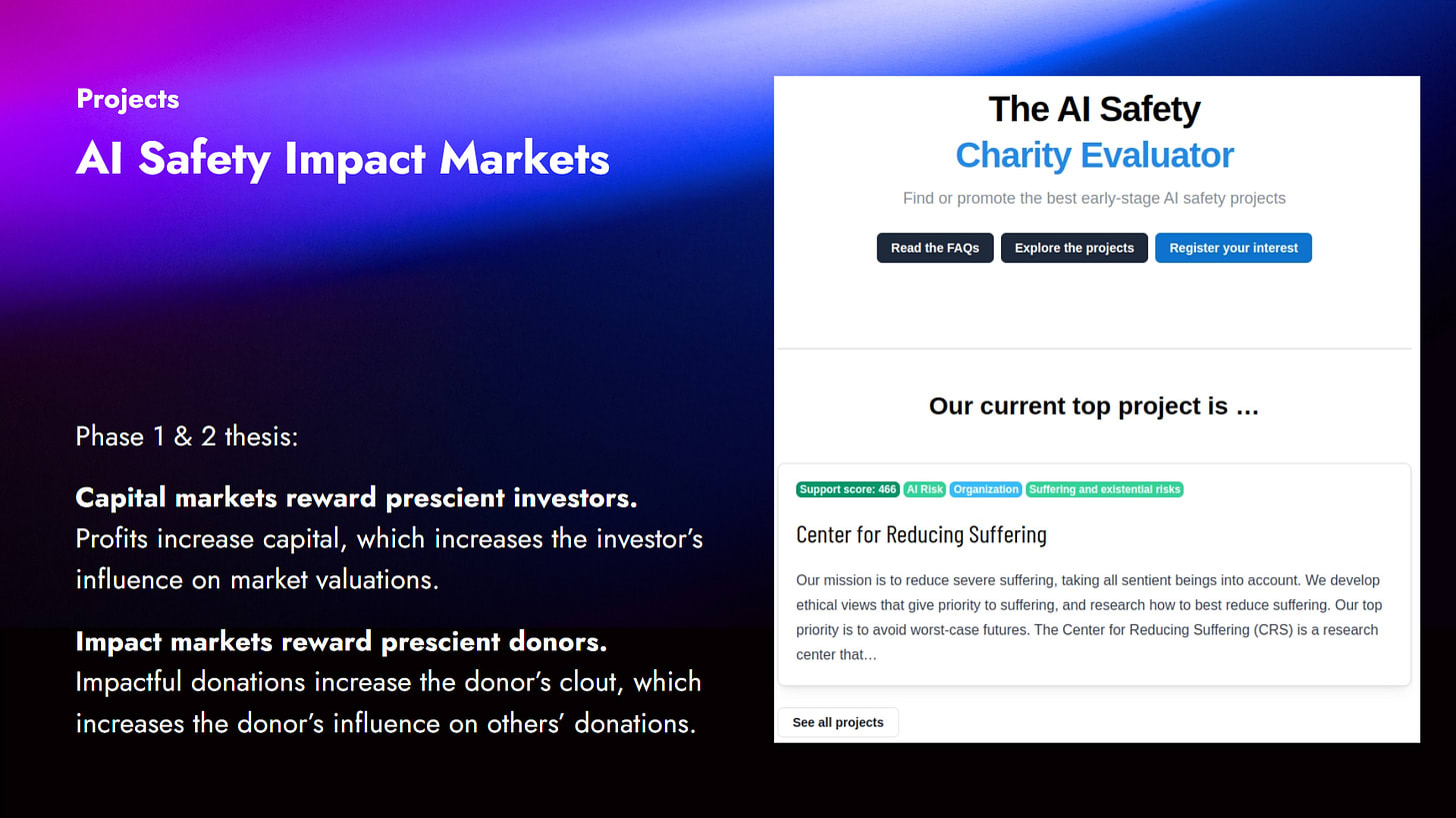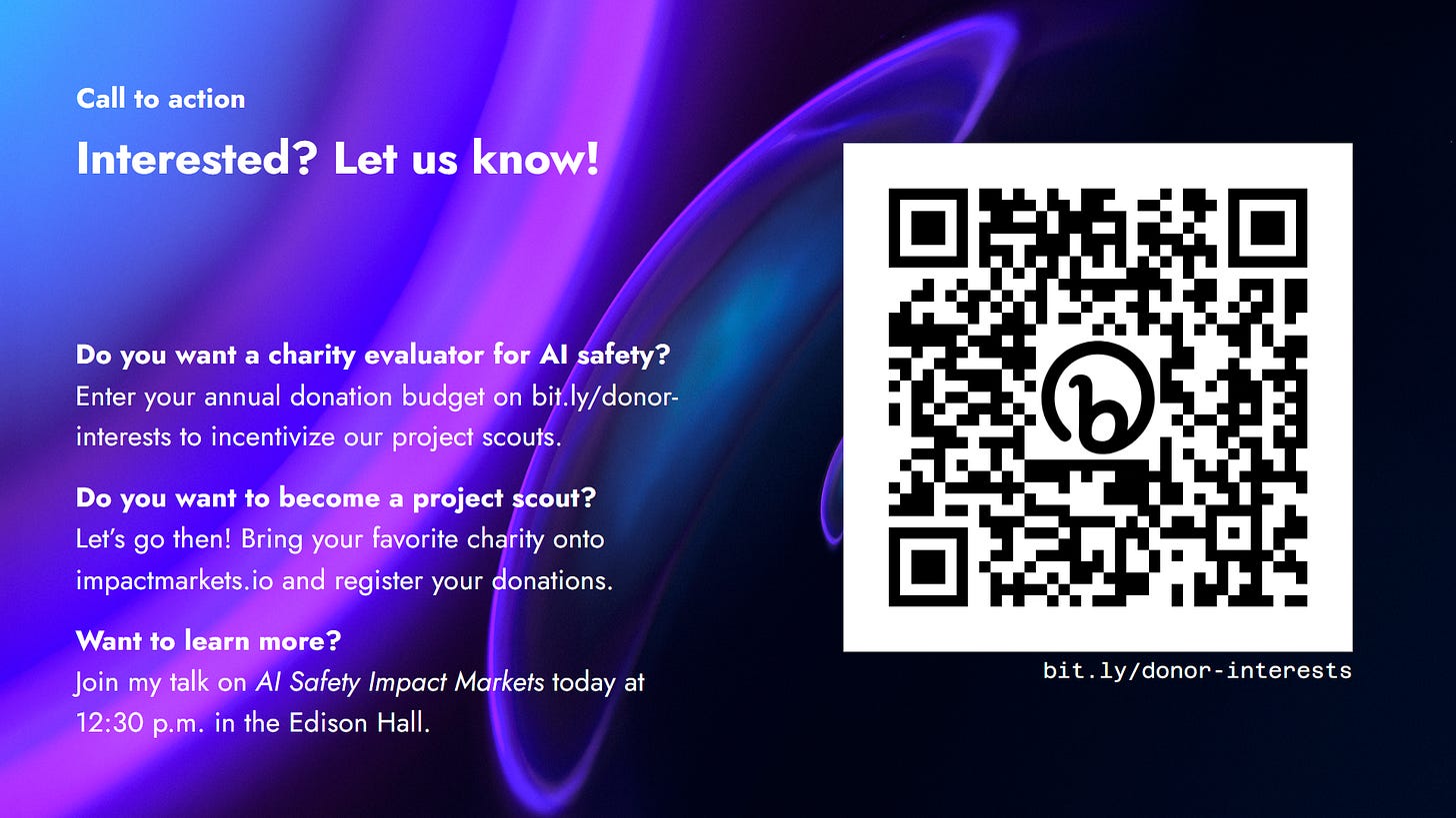 This brings me to this final call to action. If you’re interested in simply using our charity evaluator for AI safety to get donation recommendations, then that’s all live on our website, impactmarkets.io. Please just go ahead and use it.