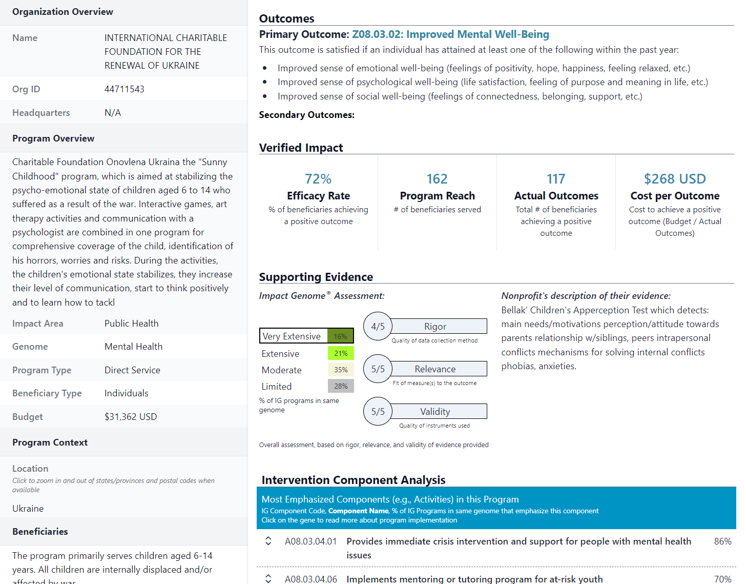 The most interesting part is the level of sophistication of the standardization of the outcomes that they have achieved. Impact Genome rates the evidence by how extensive it is, by its rigor, relevance, and validity. You also get the cost at which the outcome in question has been achieved and a benchmark from among the other projects that they have in their database so that you can compare it with them.