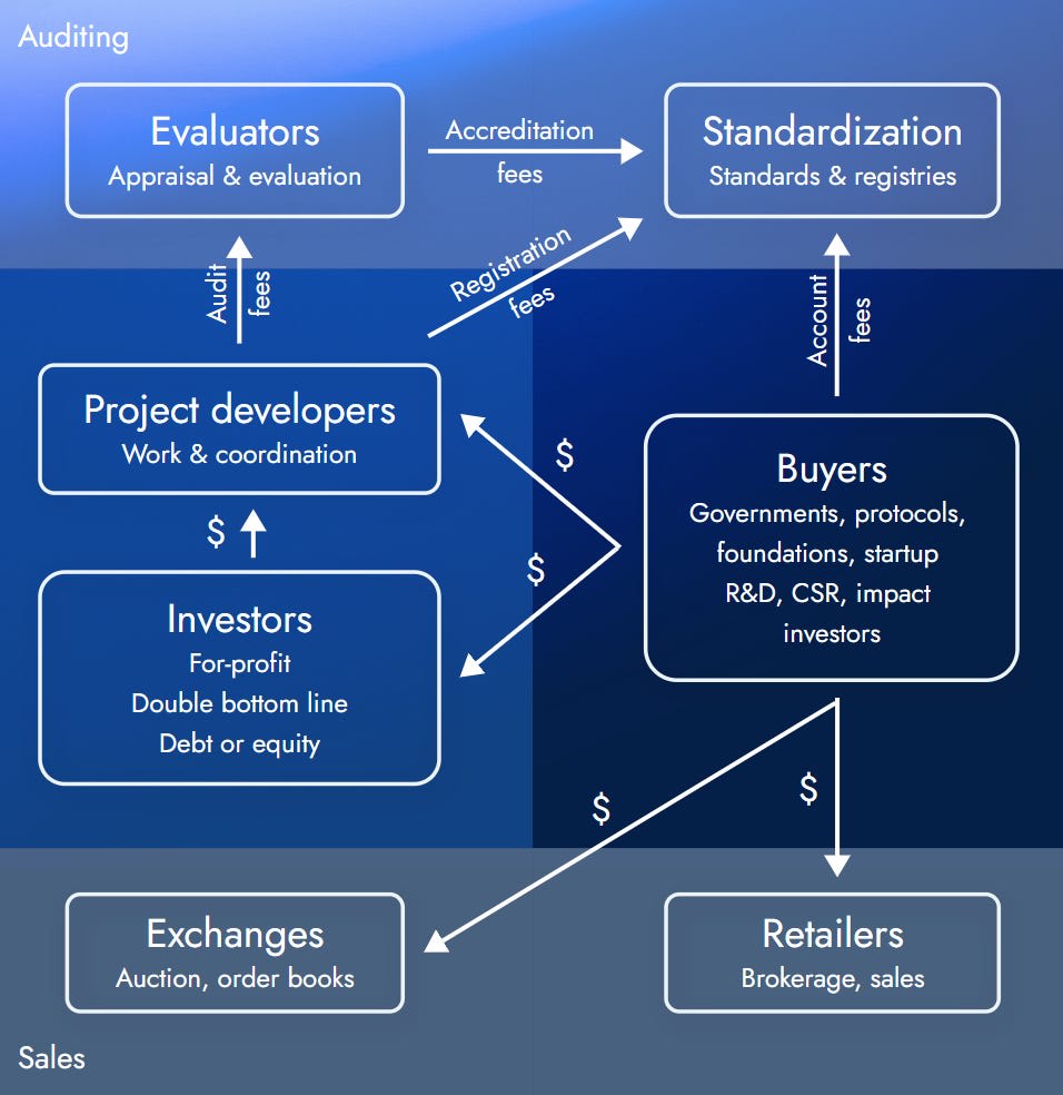 Investors that have invested in some sort of successful altruistic project can gain their impact credits from the validators, auditors, or evaluators and sell them into the buy orders that these governments or foundations have on these markets. I think that’s the vision that will probably streamline this ecosystem as much as possible, mostly going off the example of carbon credits.