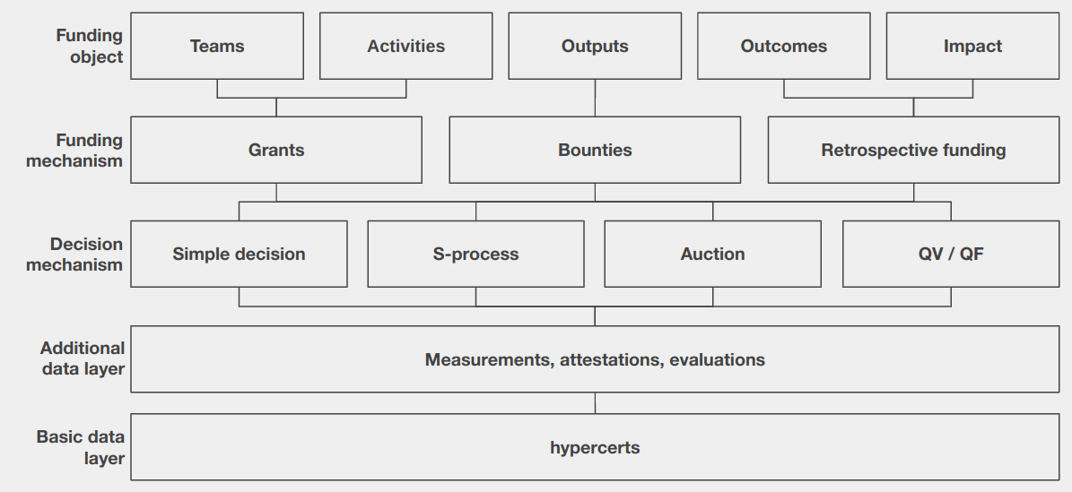 Above that are all the different kinds of auction mechanisms, for example the S-Process that I’ve mentioned before, that can be used to allocate funding. Funding can take different shapes and can come from different sources. So this is what this nice diagram shows that I’ve lifted from a presentation by Holke of the Hypercerts Foundation.