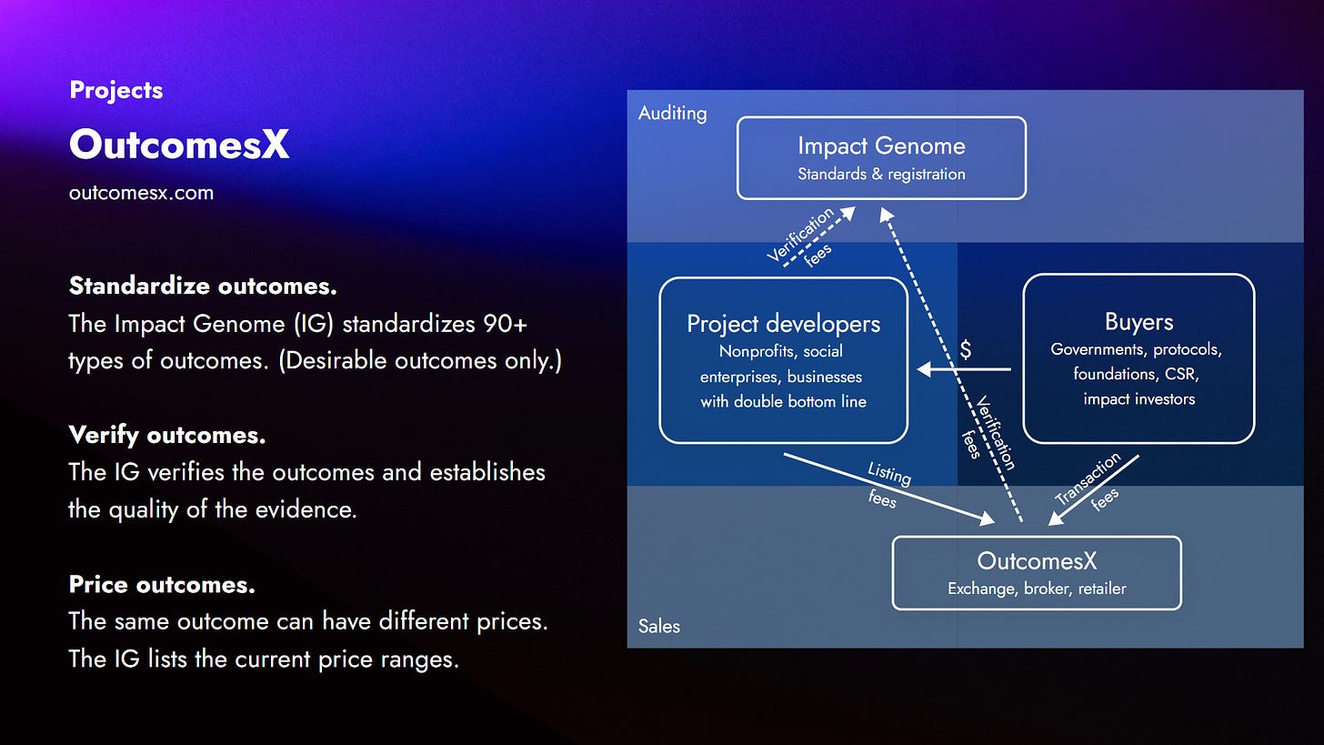 OutcomesX has that in the background for the standardization and the registration of impact claims. OutcomesX itself is basically the exchange or the retailer or broker for these outcome claims and allows buyers to purchase them and thereby retroactively fund the project developers. They don’t have investors yet at the moment. That is something that is potentially on the horizon, though.