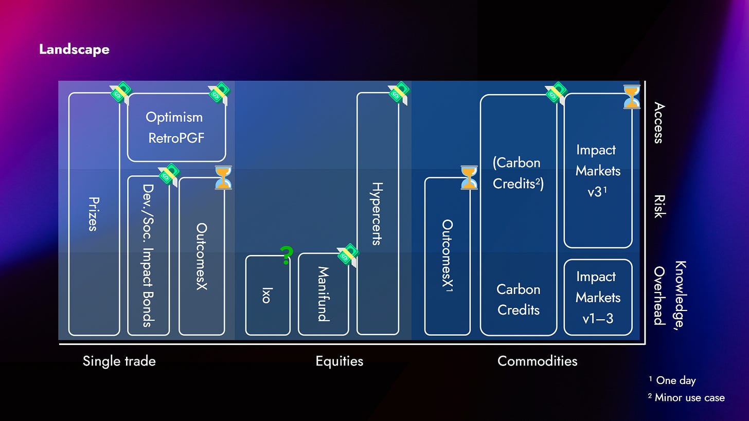 Finally of course there is our own project, AI Safety Impact Markets. Our thinking has been the following: Since all of these things that have to do with equitization of impact claims are legally really difficult, what we want to start with is something that is really legally safe and simple, something that everyone can do everywhere in the world without having to worry about legal implications, where they don’t have to be accredited investors to participate in it, where the barrier to entry is as low as we can get it.