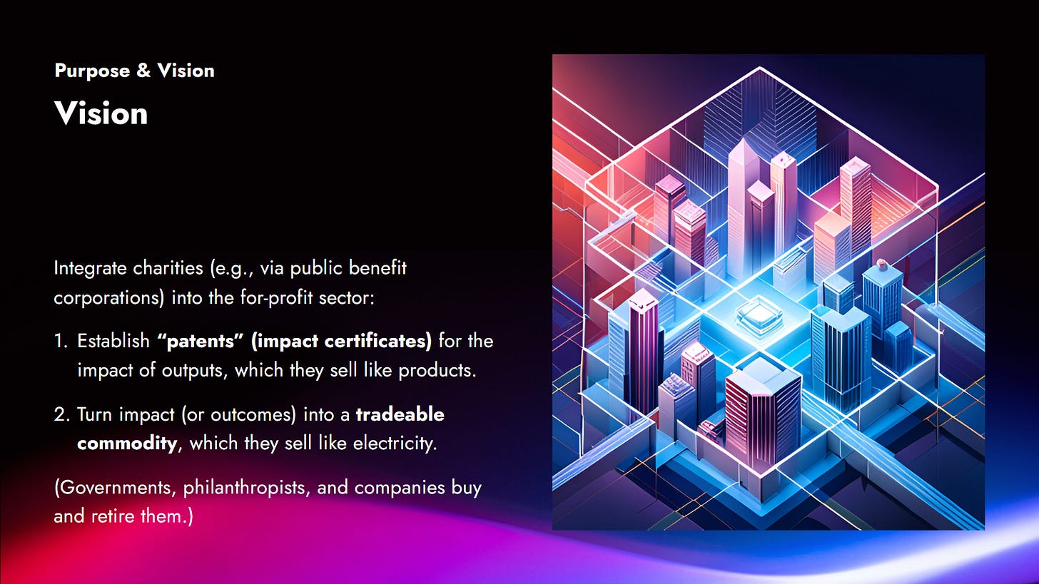 The long-term vision is to integrate charities into the for-profit sector. Currently, there is an unnecessary separation between them. If charities can incorporate not as non-profits but as public benefit corporations, they can harness this ecosystem and generate more positive outcomes more quickly.
