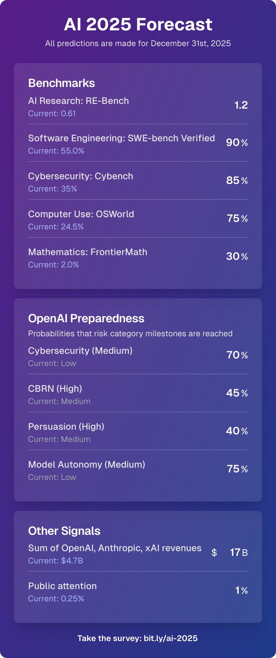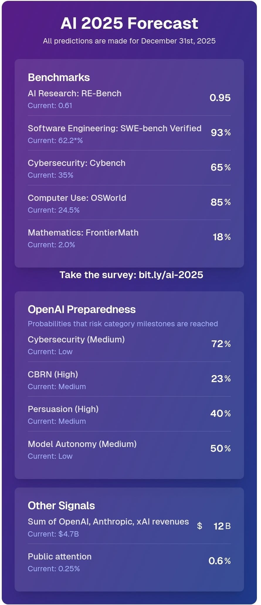 Ajeya Cotra’s AI 2025 Forecast predictions includes a 45%+ chance that OpenAI’s high preparedness thresholds get crossed, which would stop deployment until mitigations bring the threat back down to Medium. Like others I’ve seen so far, benchmark progress is impressive, but bounded.