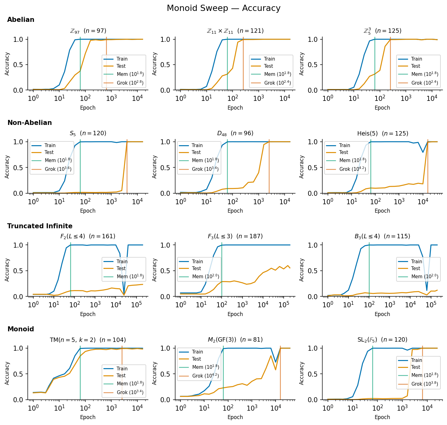 The abelian groups grok pretty quickly, the non-abelian groups grok slowly, the truncated infinite groups don't seem to grok at all, and the monoids vary.