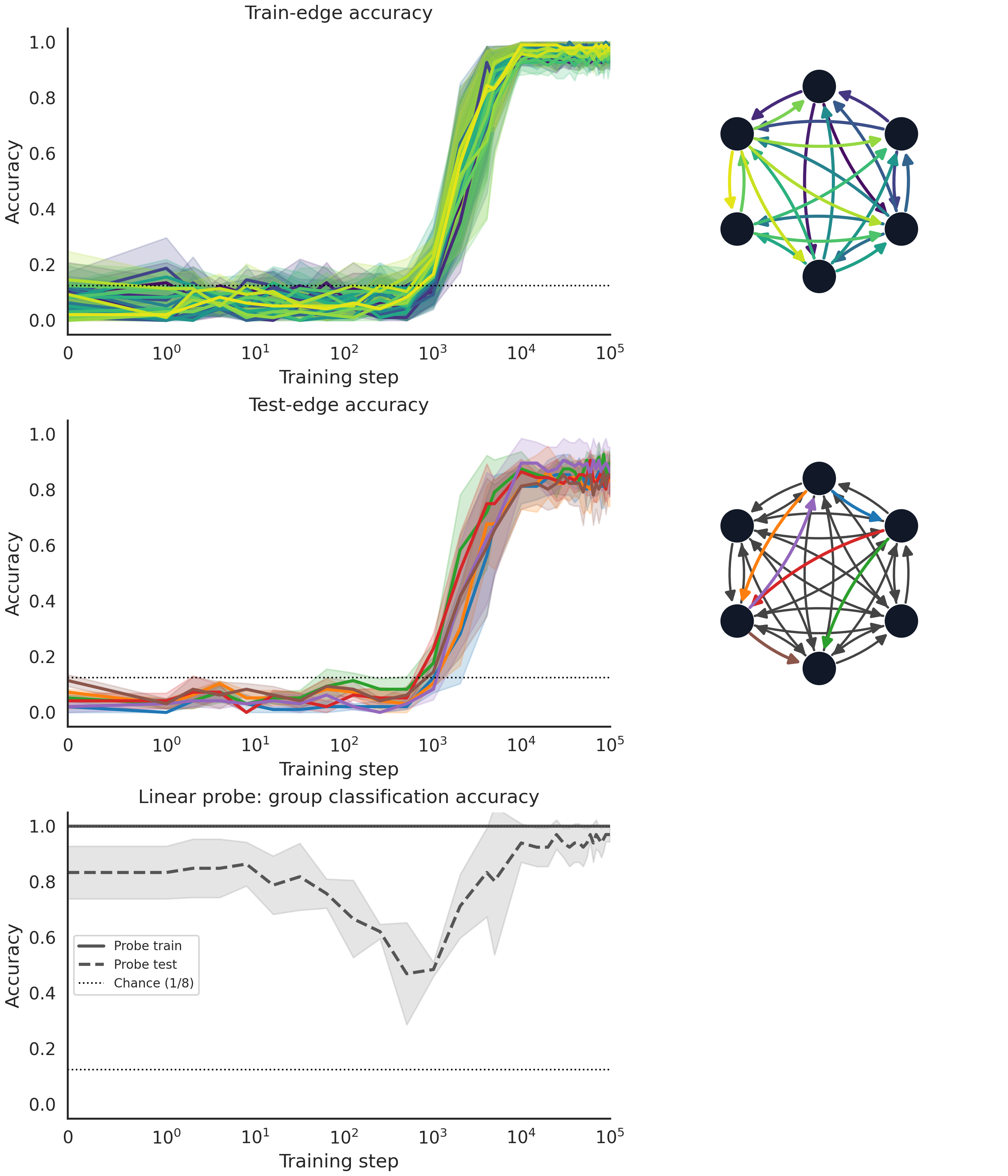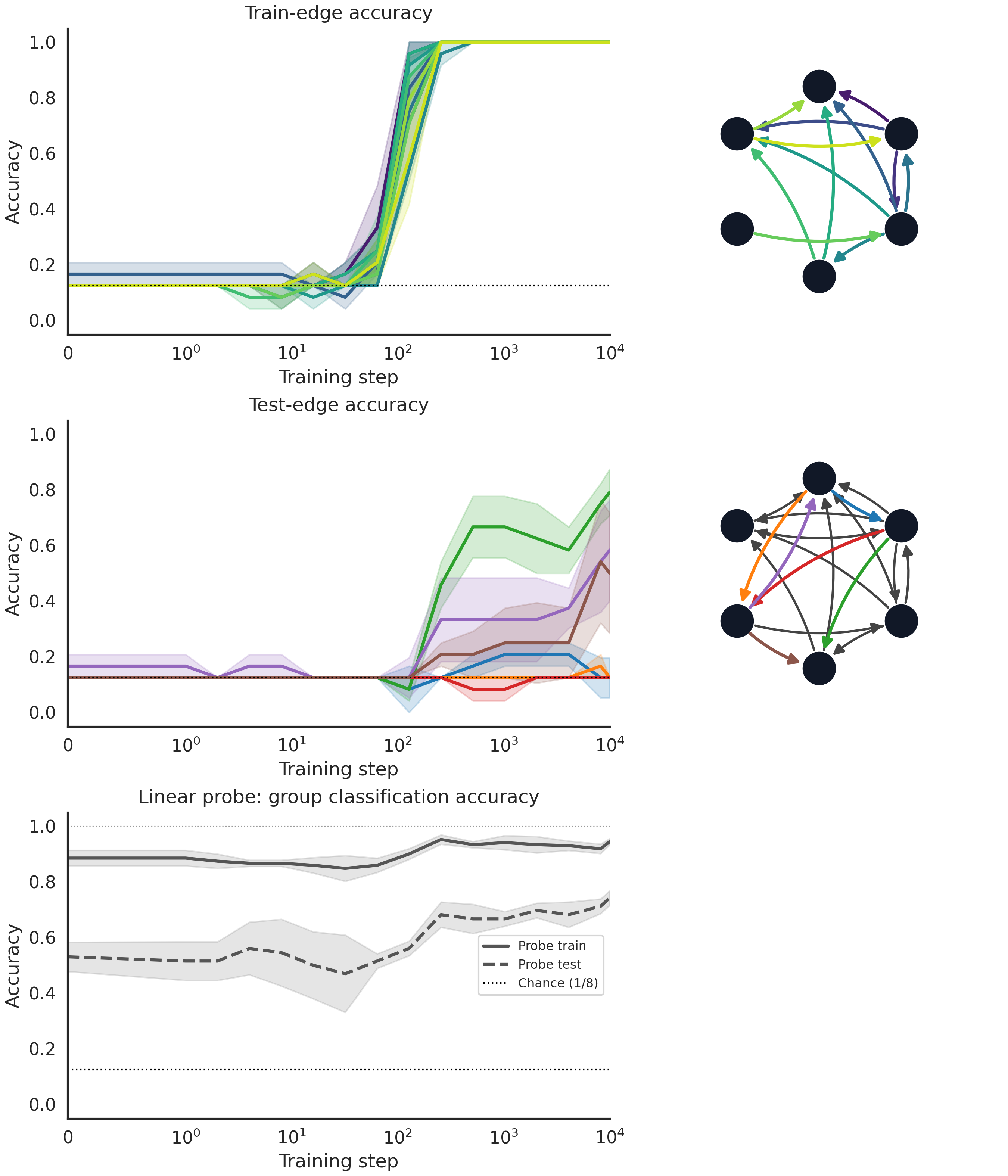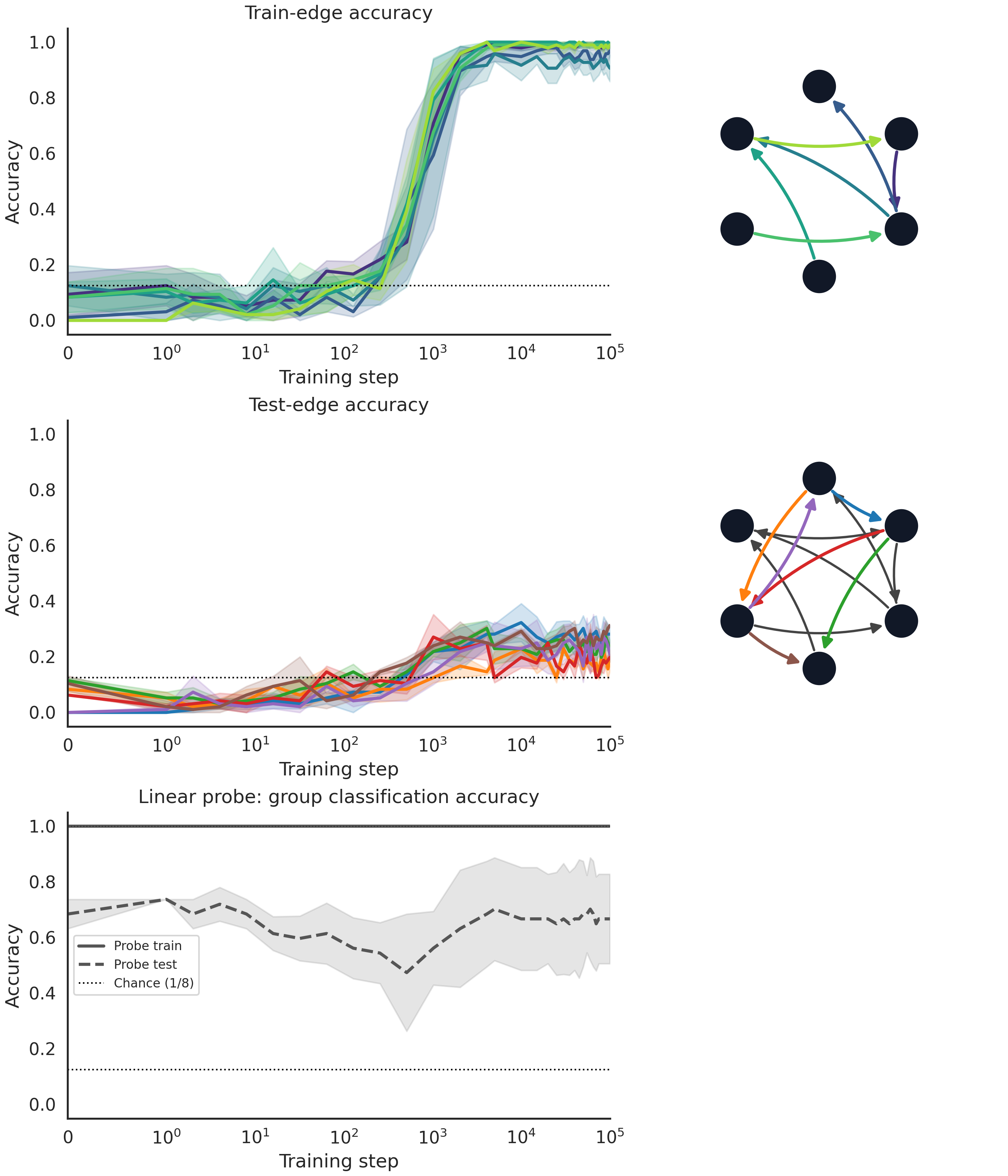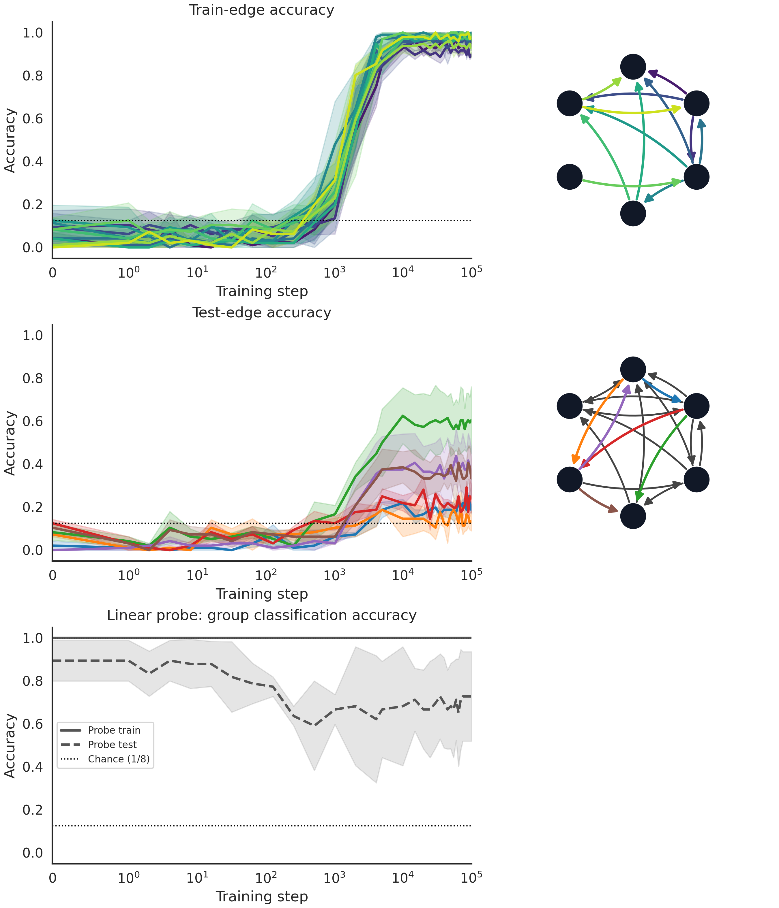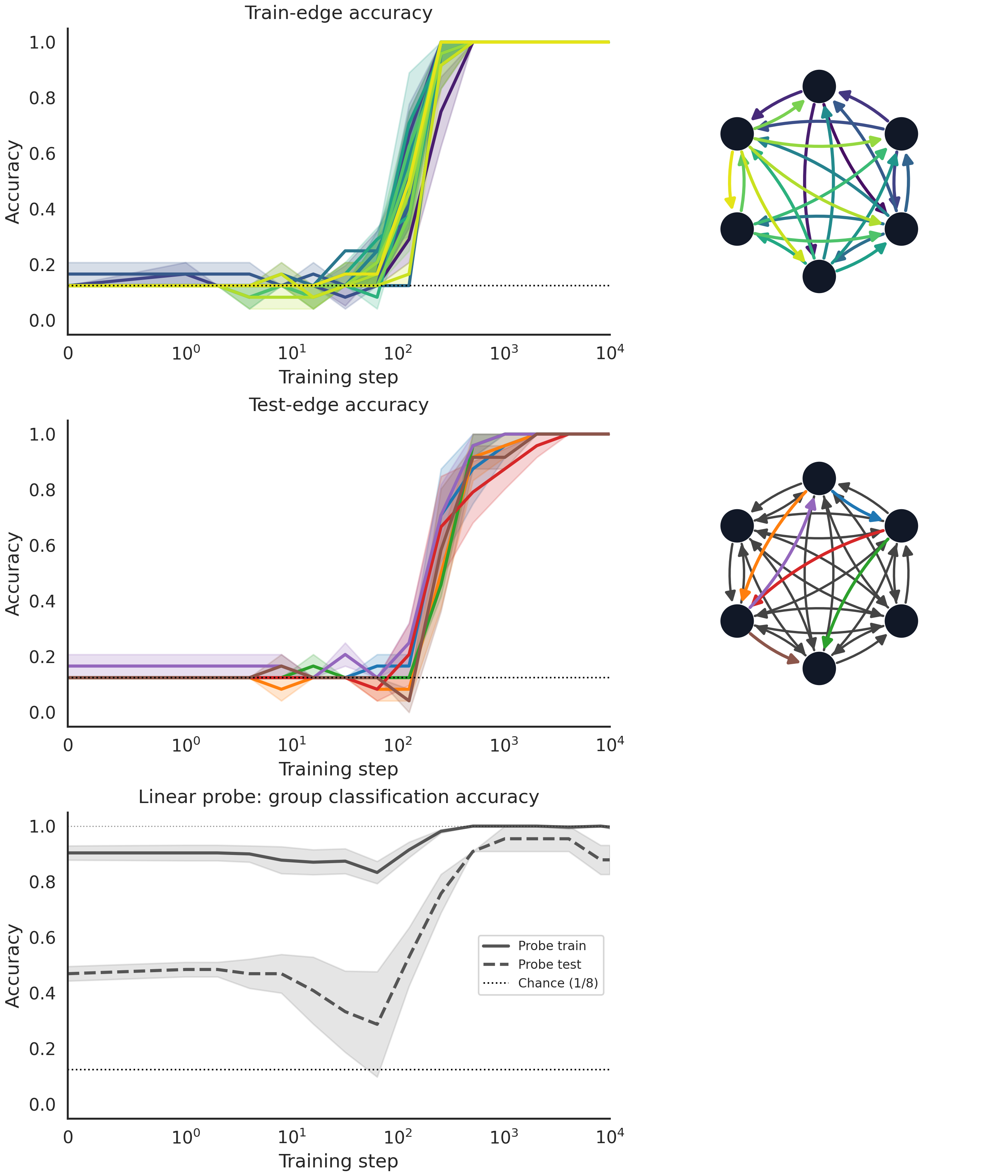 Now we see a slight climb in the accuracy around partial generalization. Interestingly, the pattern of which edges get generalized seems to be the same between the LLM and the toy model.