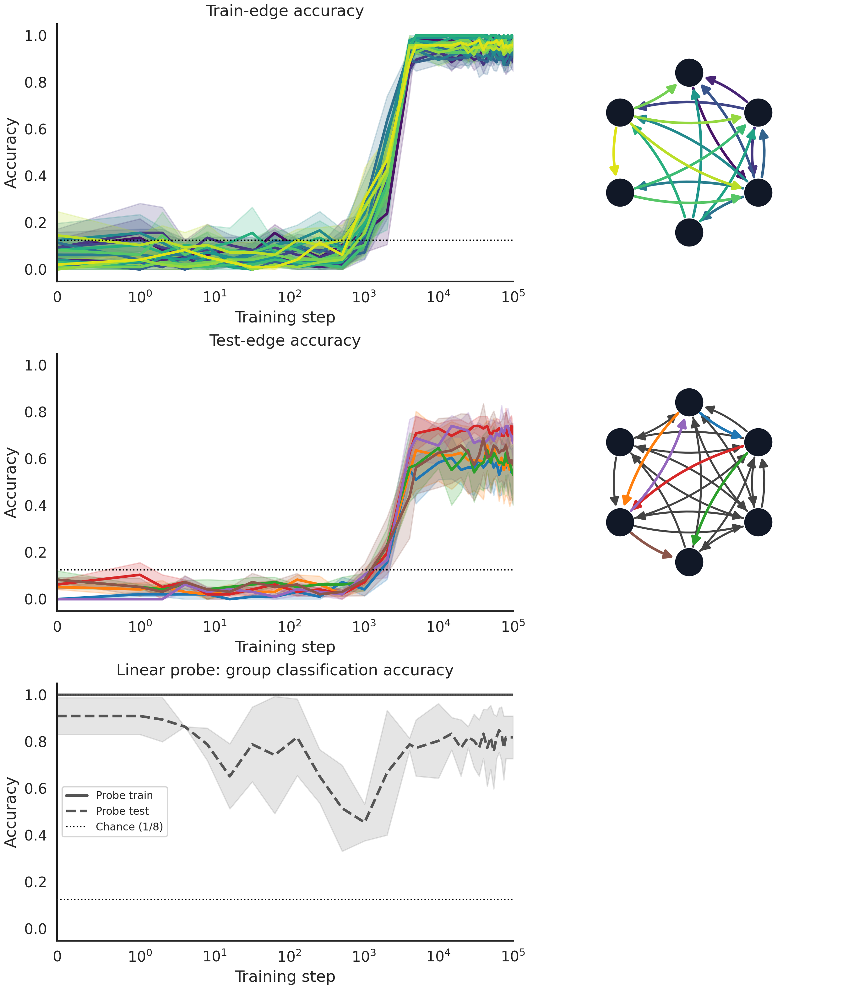 Here, some of them have successfully generalized. Oddly, at the point where the model begins to learn, the probe becomes less accurate. Now we'll try with more and more train edges. Here's 18