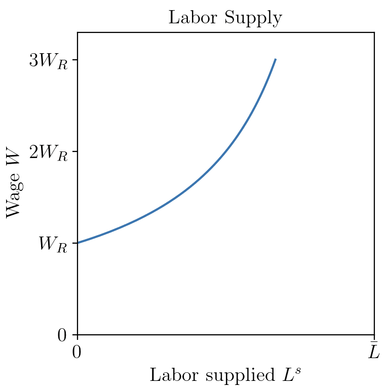 Labor supply: Labor supplied is a function of wage W, denoted Ls(W). I assume there is a reservation wage WR below which zero labor is supplied. There are a few reasons why we should expect a reservation wage: