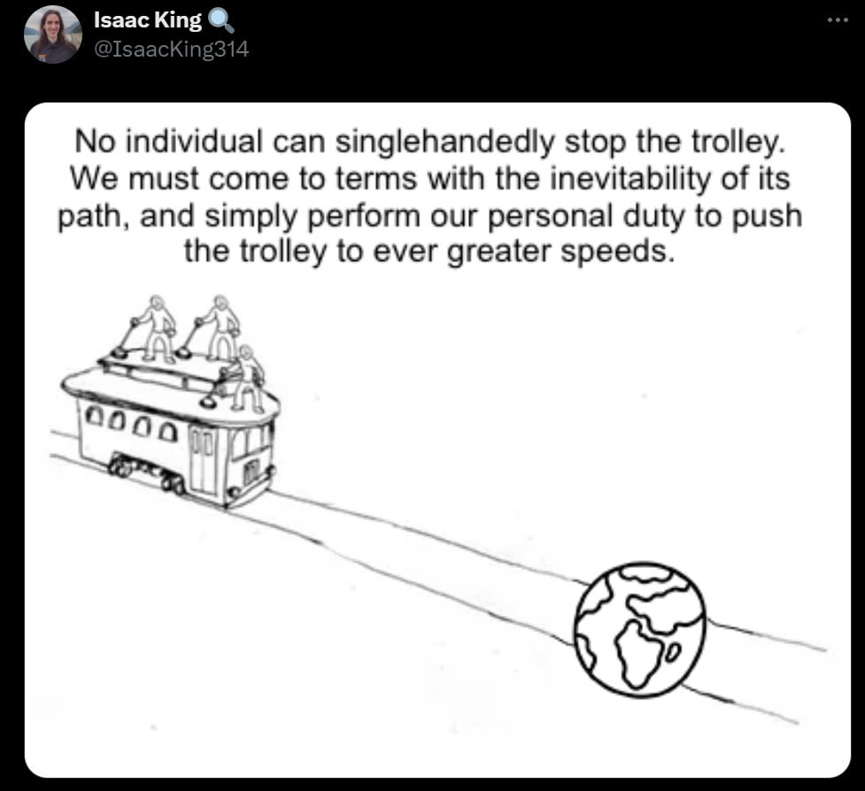 There are those that say if you do not attempt to bind the highly capable AI, that somehow you will fail to have that very bad time, but I strongly believe every justification for this is the weakest of hopium or outright gibberish. It does not make sense. Unleash a bunch of much more capable and intelligent agents into the world to pursue various goals and the future belongs to them in short order. We do not need to make this more complicated than that, and can argue about how fast there cease to be humans or whether anything of any value survives that transition.