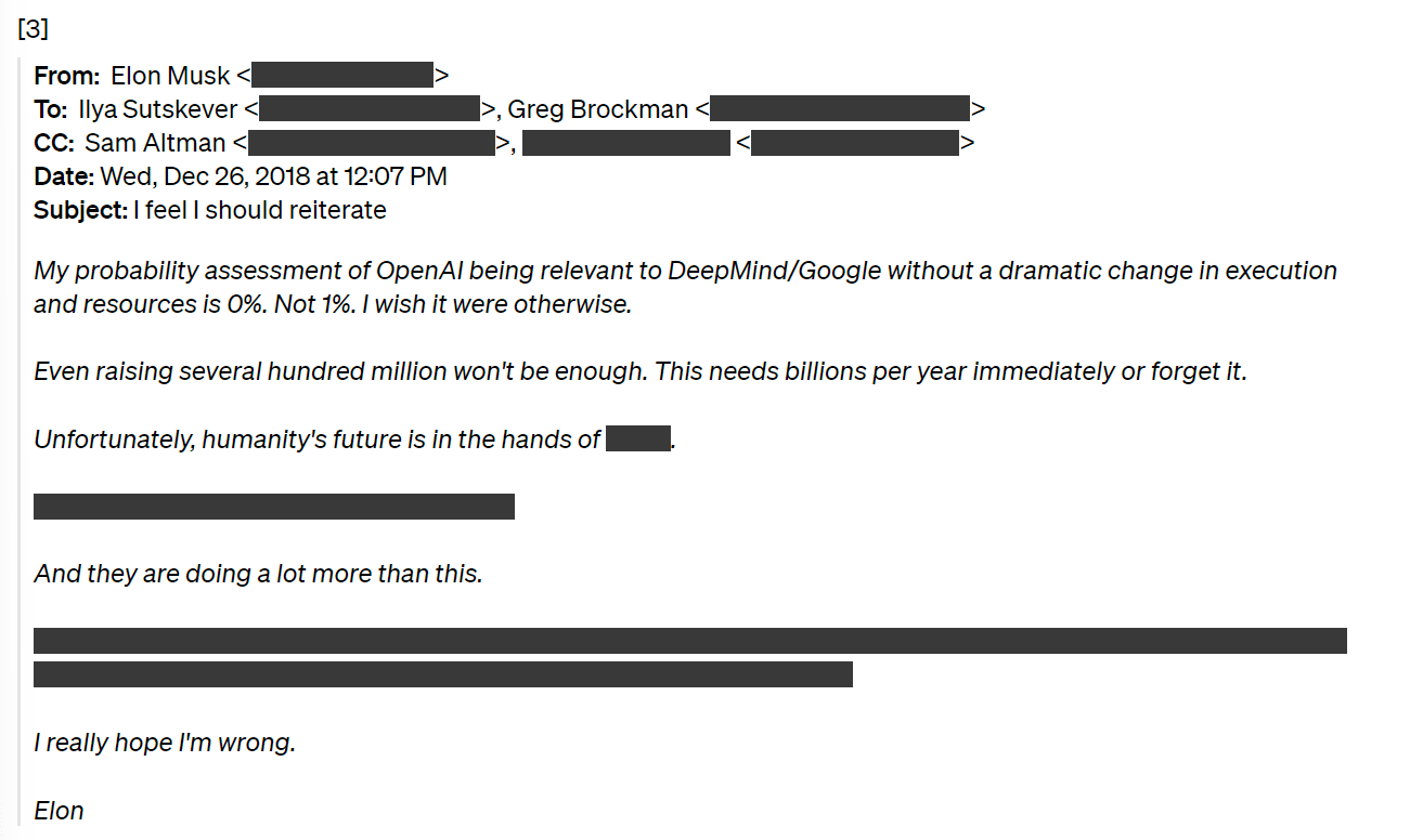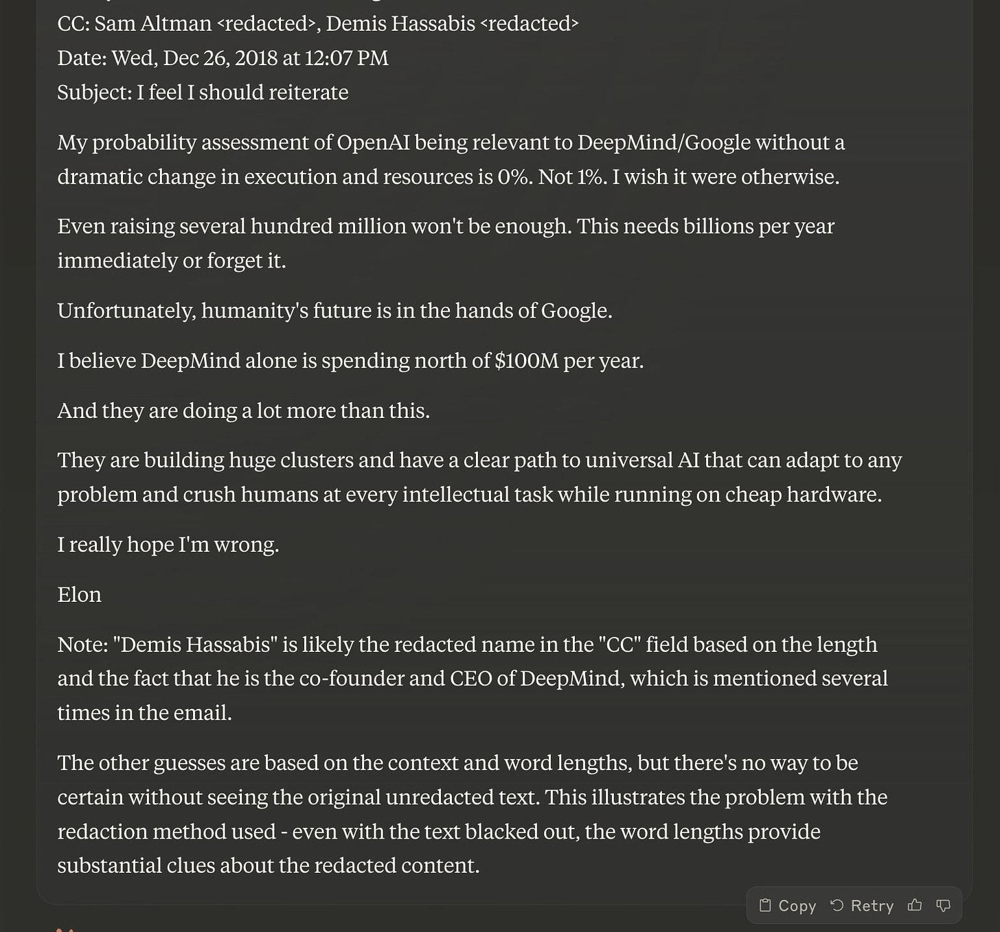 They quote several partially redacted emails as evidence, one of which is below. Which raises the point that a company that will need to deal with cybersecurity and intelligence and game theory issues around superintelligent AI does not, as several including Gwern pointed out, know how to redact things without giving away what they are via the bar lengths?