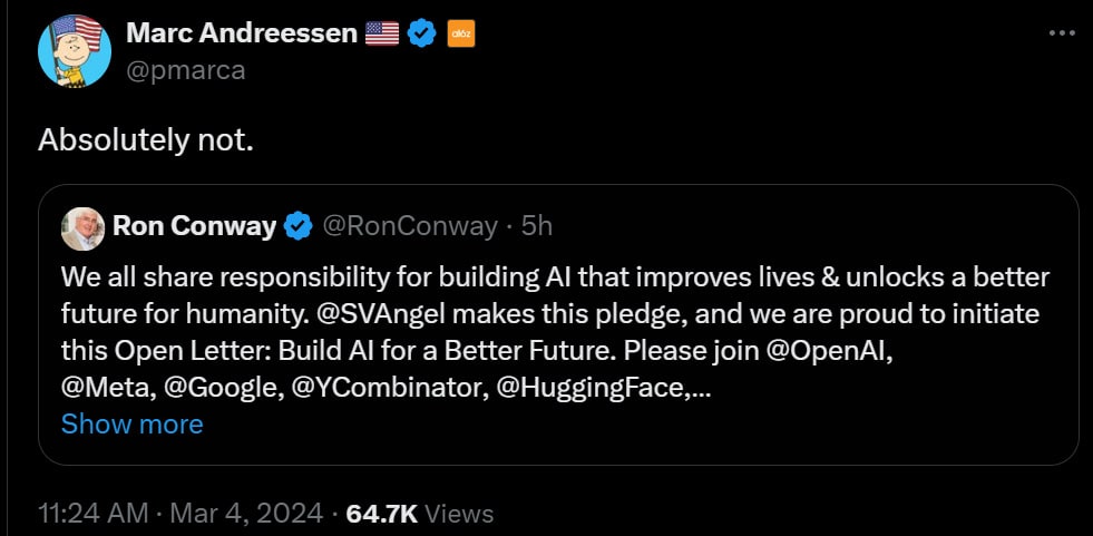 The latest is from Ron Conway, signed by lots of the key major corporations, including OpenAI, Meta, Google, Y Combinator, Hugging Face, Mistral, Eleven Labs, Microsoft and so on. Quite the list.