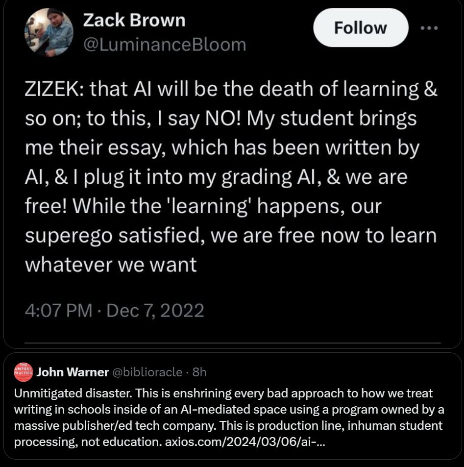My very short experience attempting to be a teacher taught me, among other things, that the burden of such grading is overwhelming. My experience as a student says that it is not like the teachers are grading our essays with bespokeness. My experience as a parent is also not going to cry any tears here.