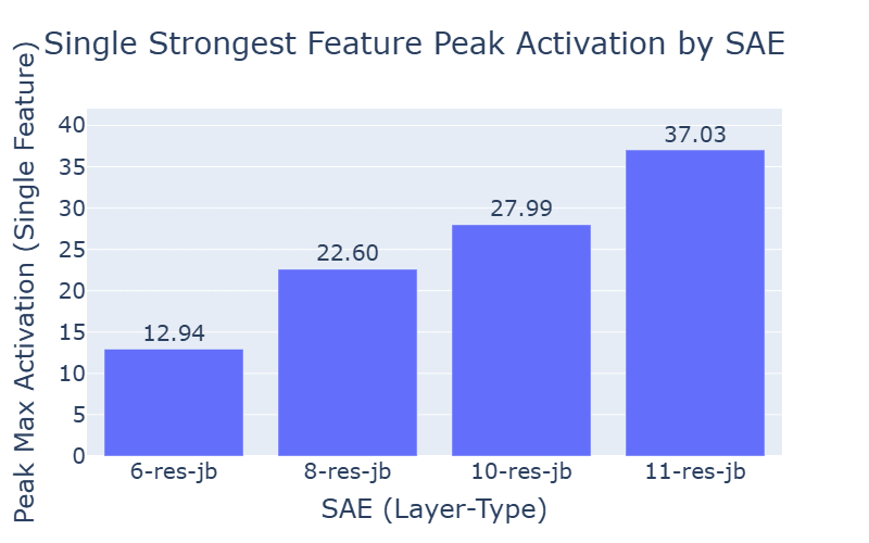 The strongest features analysis identified which SAE dimensions produced the highest activation values across the test dataset. The results revealed a clear pattern: peak activation magnitudes increase substantially with layer depth. A summary of these findings is shown in Figure 4.