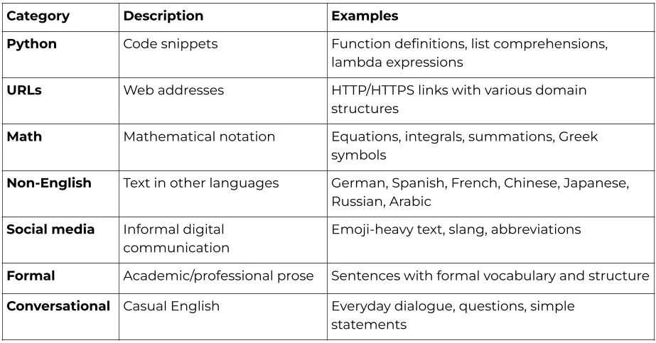 To examine how features respond to different types of content, a test dataset of 70 texts was constructed, spanning seven categories. Those categories are described in Figure 1 below. A complete list of the test texts is available via the Phase 1 Jupyter notebook on the project’s GitHub repo.