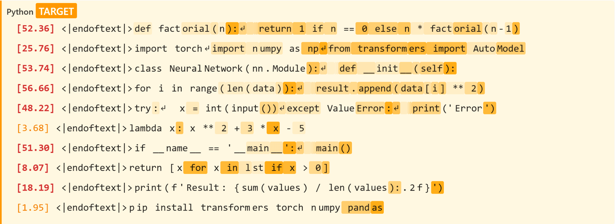 Python specialist (Feature #15983): Fires on Python structural syntax, particularly “):” patterns at the end of function and class definitions, closing parentheses, and Python keywords like “for”, “in”, and “if” in comprehensions, apparently detecting Python's grammatical markers, not programming concepts. The activation of this specialist against the Python sample text is shown in Figure 9.