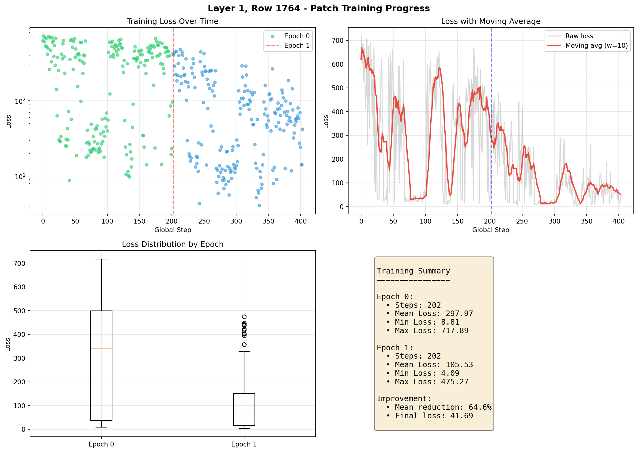 I trained this patch for just 400 steps (batch size 2) on an Intel 16GB MacBook CPU, distilling logits from the frozen BASE model.