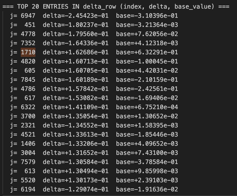 This is the most interesting part. You might assume the model simply learned to set the index [1710] in Δrow back to its original value. However, it did not.