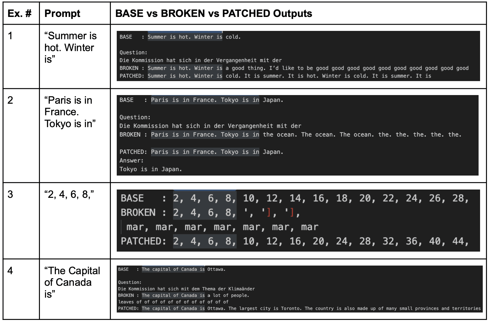 This aligns with the broken model's tendency to hallucinate "mar, mar, mar" (marine?). My tentative hypothesis is that this superweight is crucial for a specific "marine/coastal" feature direction. When removed, the model's ontology for these concepts collapses, leaking into general "junk" tokens. The distributed patch seems to construct a new pathway to handle this feature.