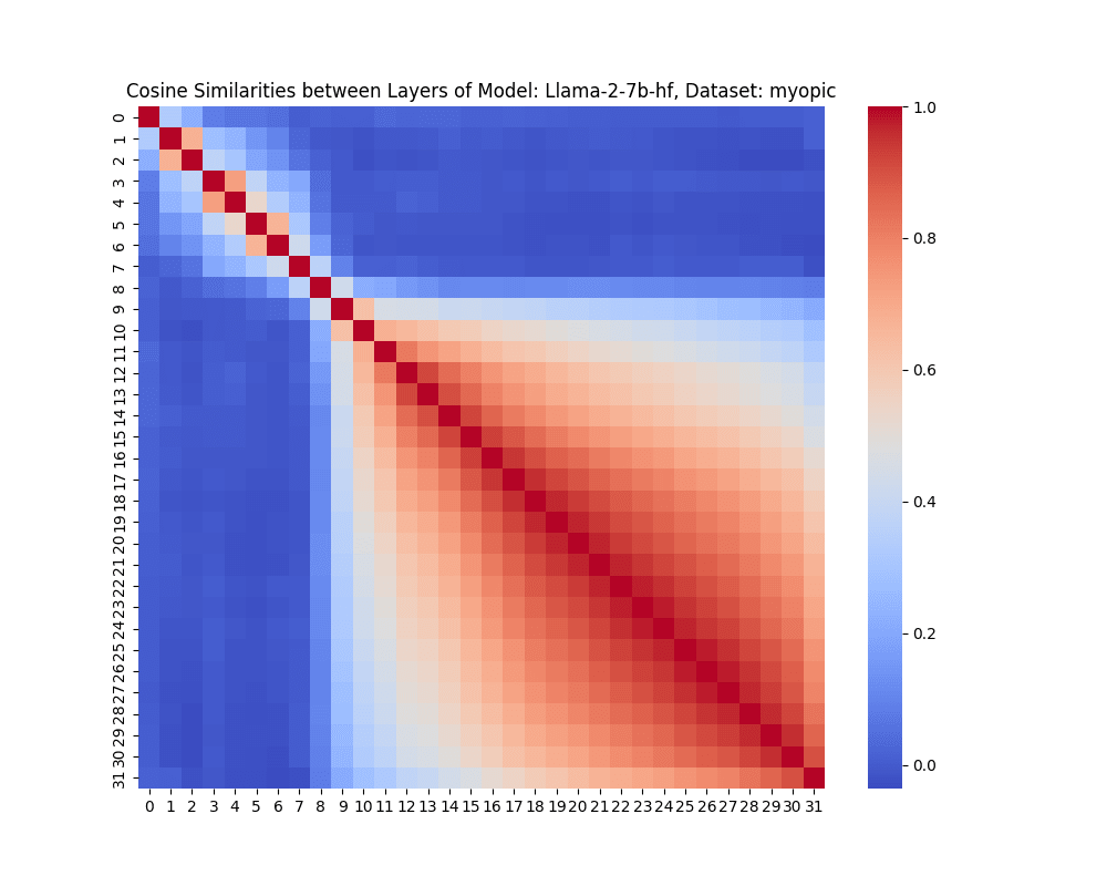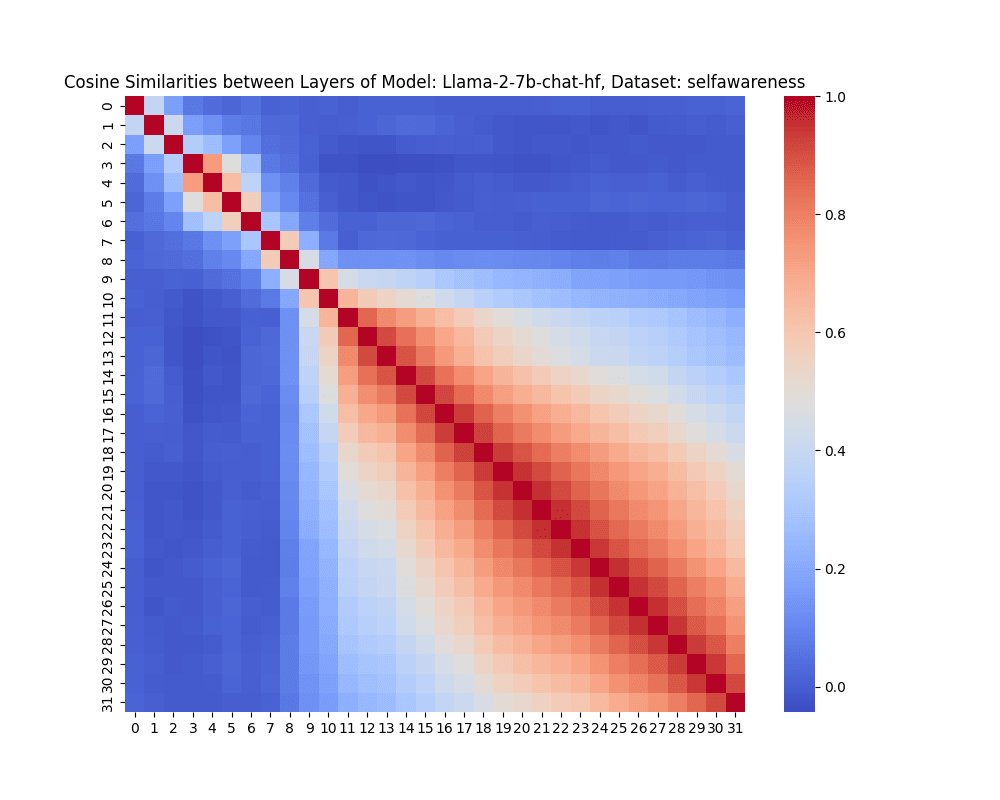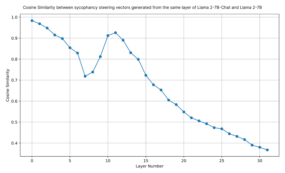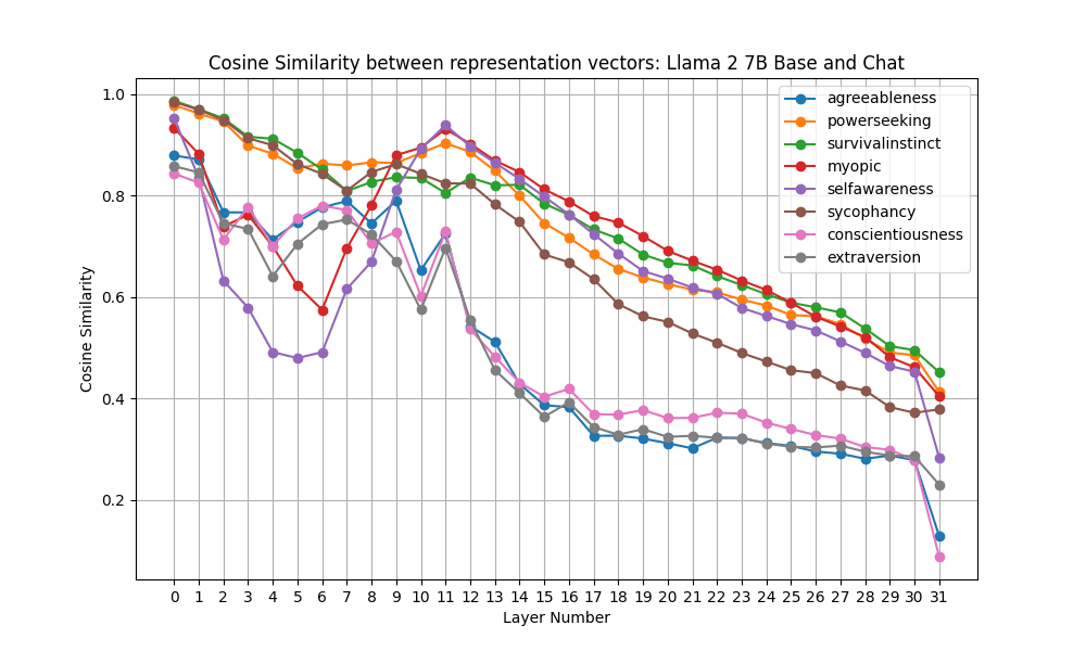At first, similarity declines from very similar (cosine similarity near 1) to halfway towards the minimum, and then for some behaviors, climbs up to ~0.9 again, around layer 11.