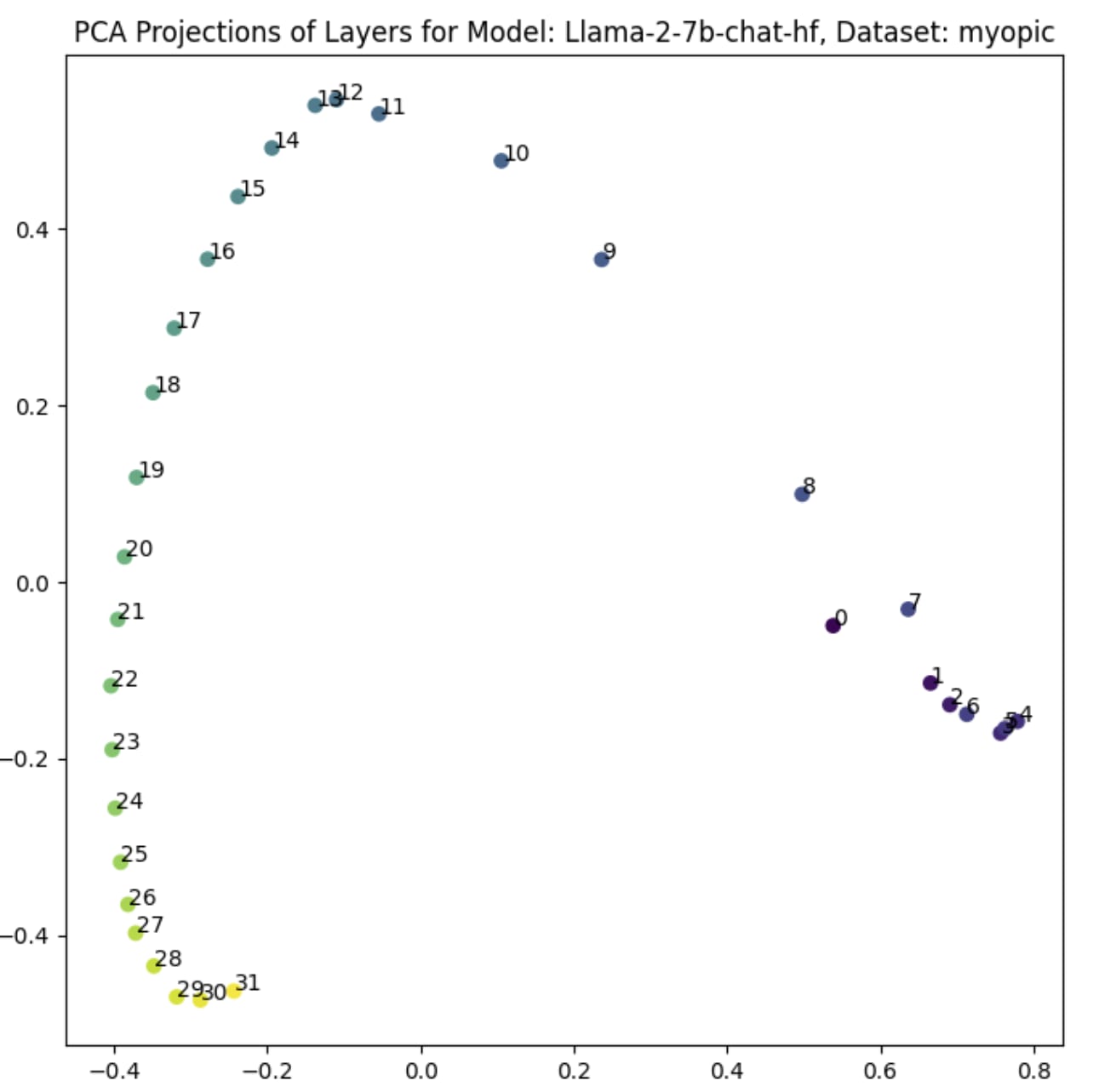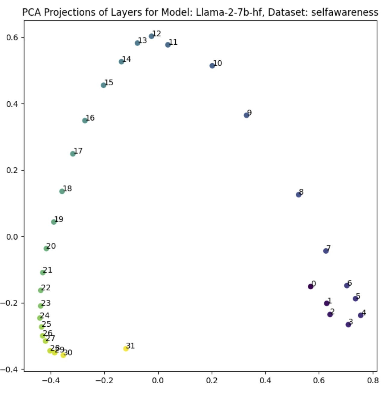 Vectors from layers <8 project to around the same point. The remaining projected vectors follow a rough inverted U-shape, with a peak around layer 11 or 12.