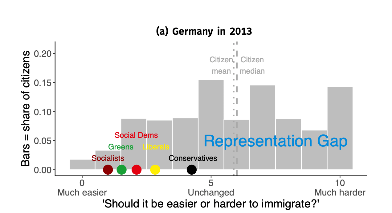 The grey bars represent voters’ attitude towards immigration. Vast majority of voters feel that immigration should be made harder. Yet, all political parties, including the conservative CDU, believe that immigration should be made easier.
